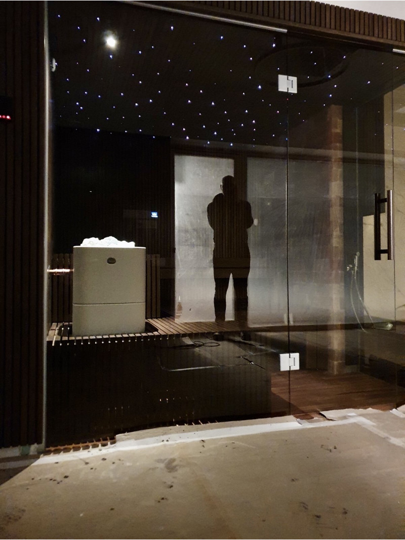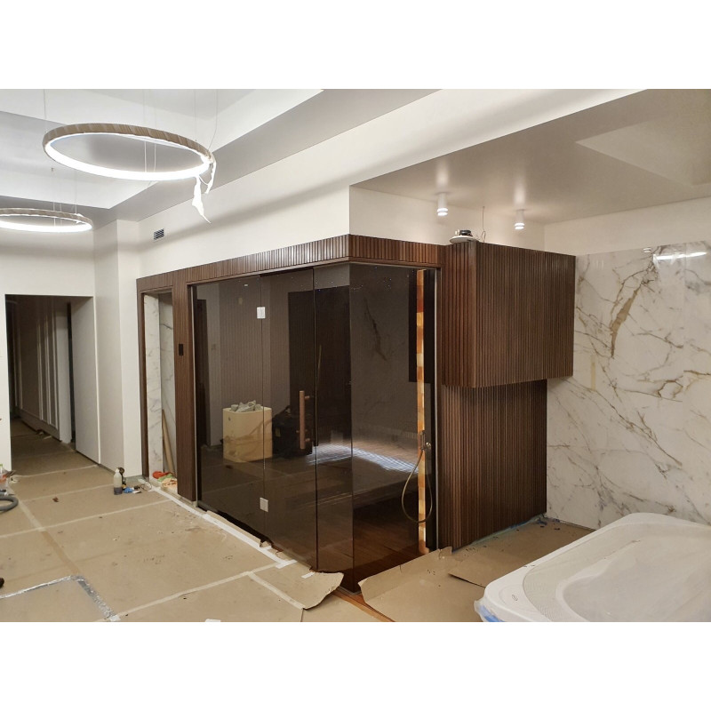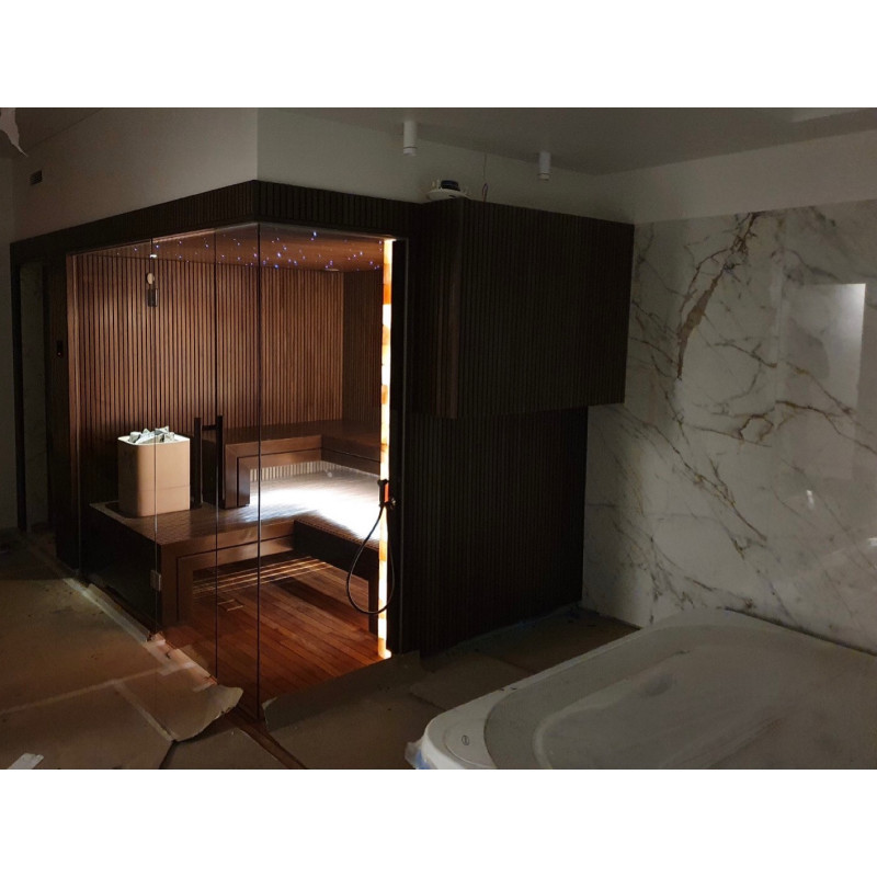Un projet de sauna individuel a été mis en œuvre à Vilnius. Bois de tilleul sélectionné recouvert de cire naturelle avec couleur. Réchauffeur blanc Tulikivi Kuura 2 avec un générateur de vapeur de bain turc séparé (Harvia 4,5 kW) introduit dans le réchauffeur. Ce système produit une très grande quantité d'humidité secondaire.