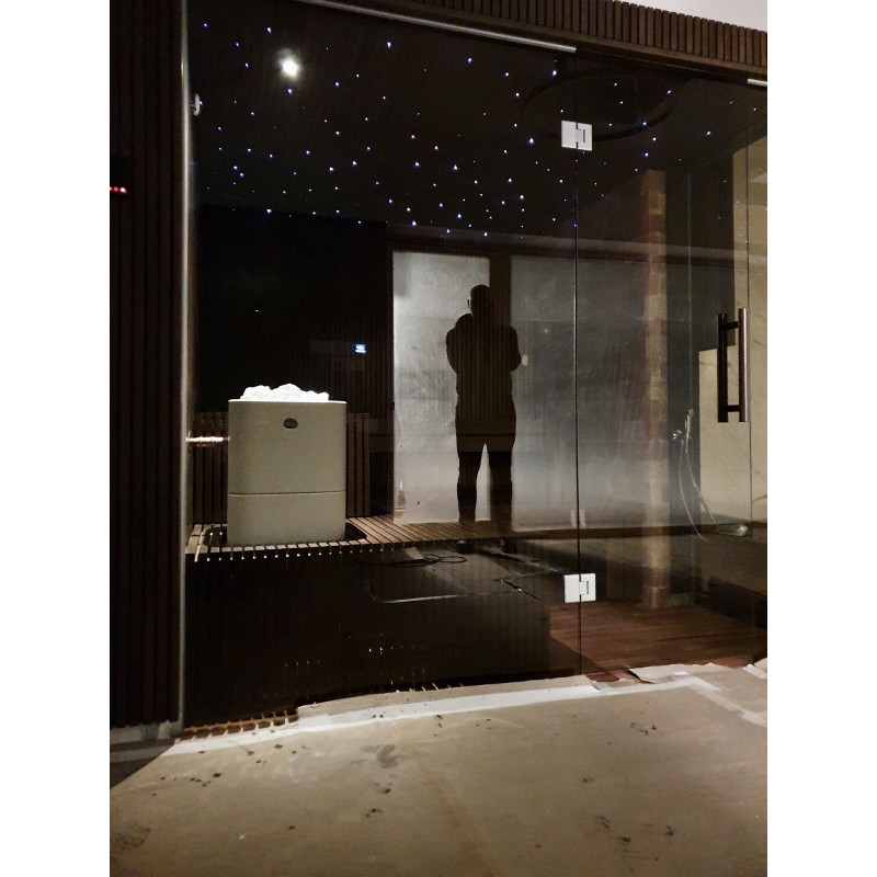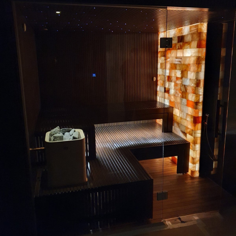 Les briques de sel de l'Himalaya choisies pour la décoration du sauna avec éclairage intégré créent une ambiance chaleureuse et renforcent encore l'effet du sauna. Les pierres de sel de l'Himalaya sont un ioniseur naturel qui améliore efficacement la qualité de l'air en émettant des ions négatifs. L'air ionisé négativement améliore la santé, aide à traiter de nombreuses affections telles que : asthme bronchique, maladies pulmonaires et bronchiques, post-infarctus, hypertension, ulcères gastro-intestinaux, gastrite, maladies de la thyroïde, dermatite, allergies diverses, maladies nerveuses, aide à surmonter les accidents vasculaires cérébraux. Les avantages de faire les procédures dans un tel sauna seront doubles.