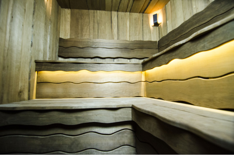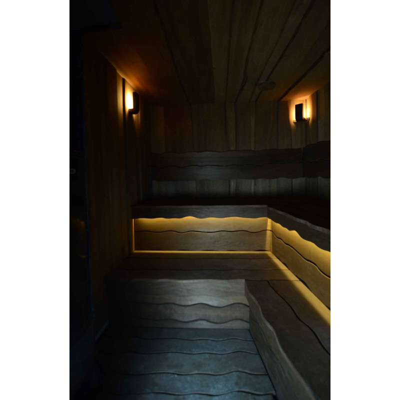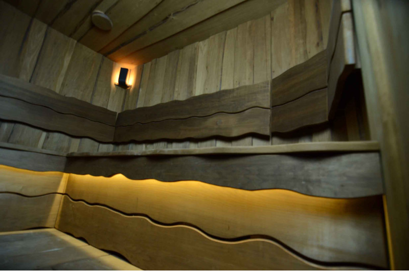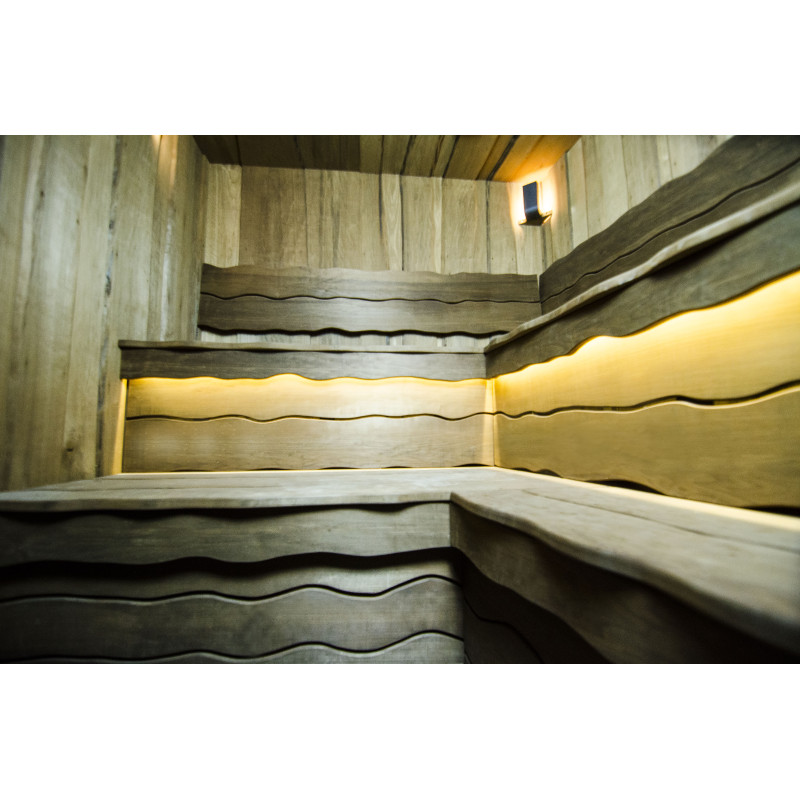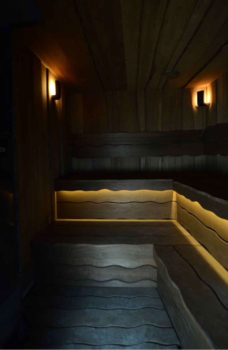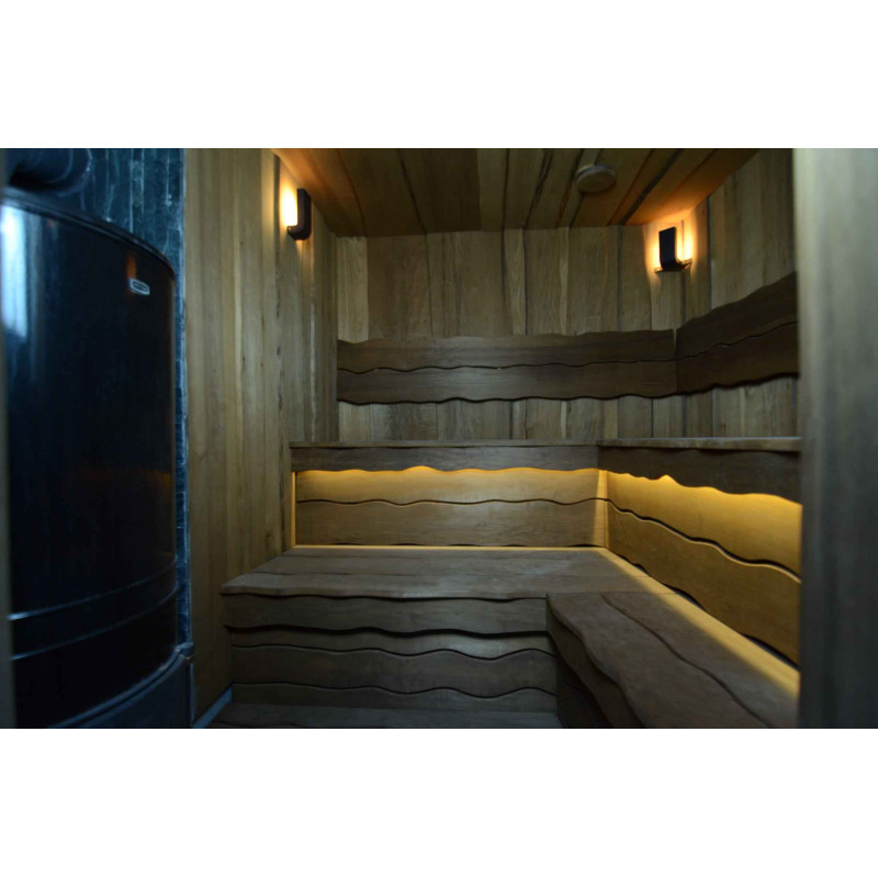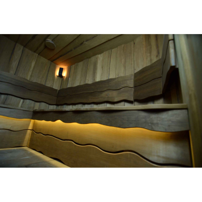 Du bois de tremble brûlé a été utilisé pour décorer les murs et le plafond du sauna, ainsi que les bancs et les dossiers. Des planches rabotées à coupe unique ont été choisies pour donner au sauna confort et naturel.
