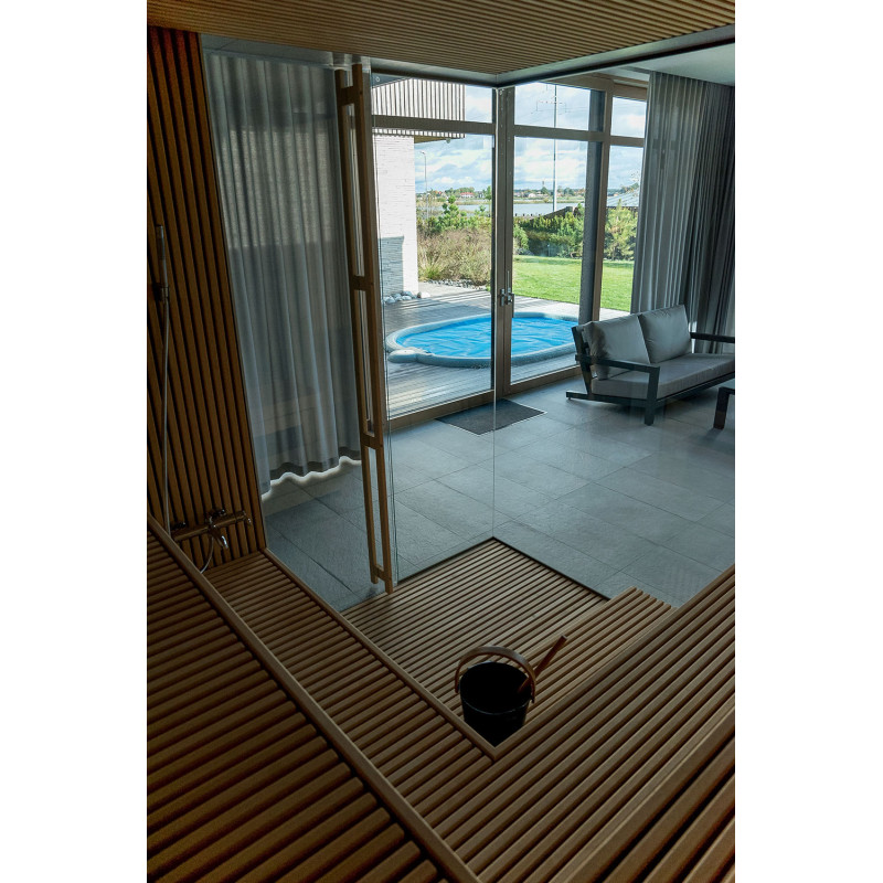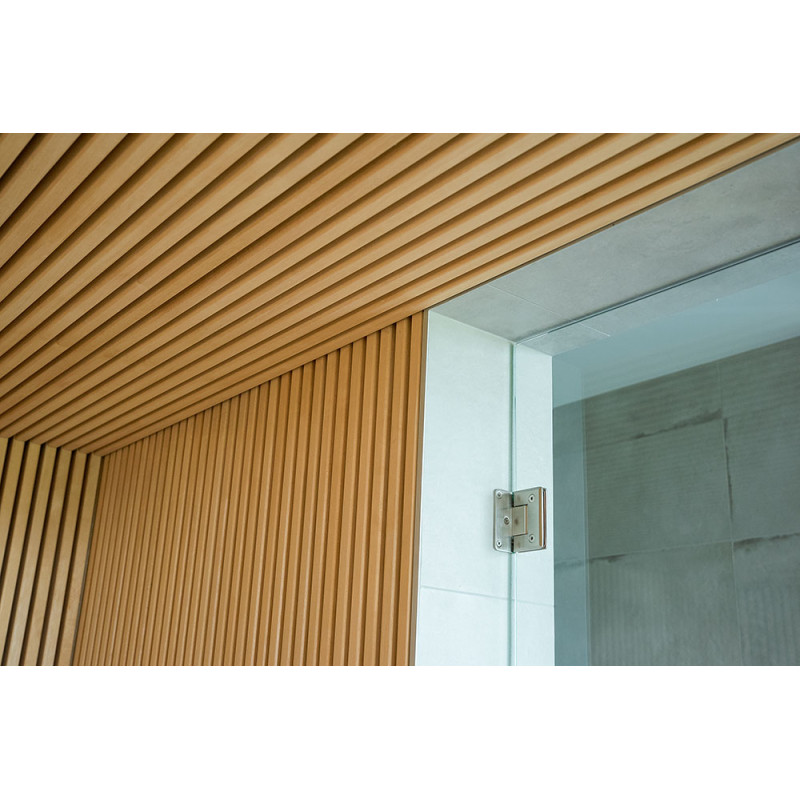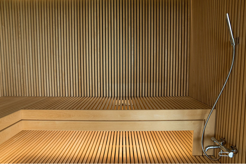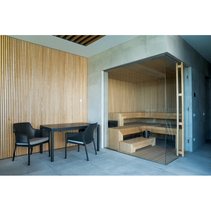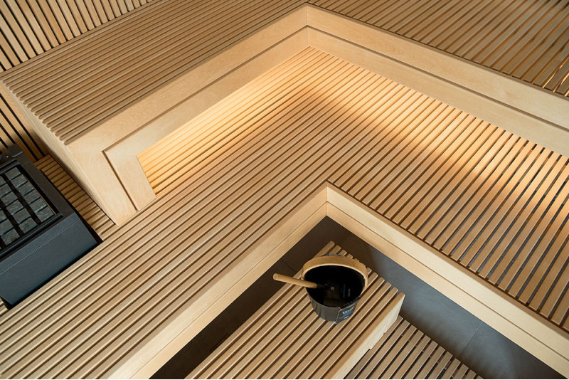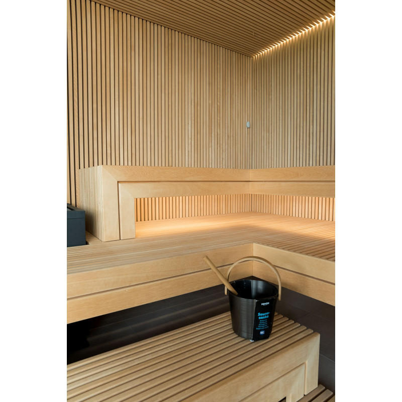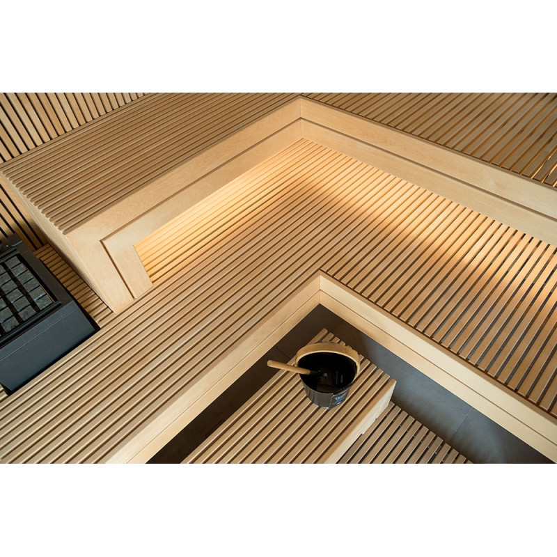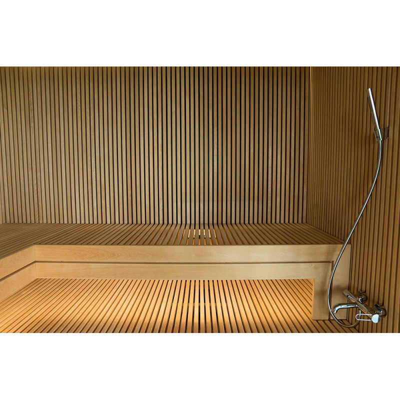 Le bois très léger choisi est l'abachi. Chaleur douce et faible. Cette caractéristique positive vous permet de profiter des plaisirs du sauna en tout confort. L'éclairage à fibre optique met en valeur la structure du bois. L'éclairage aménagé sous les transats et le plafond serpente horizontalement sur tout le mur et illumine confortablement les lames de bois ajourées.