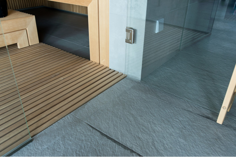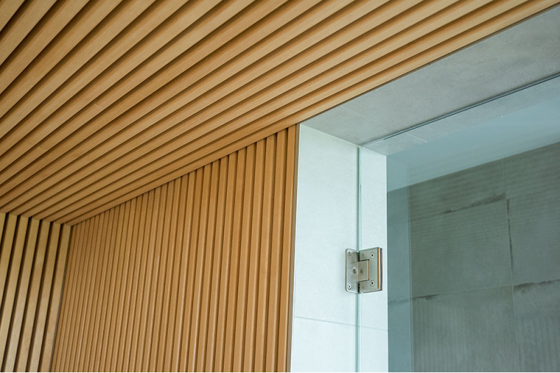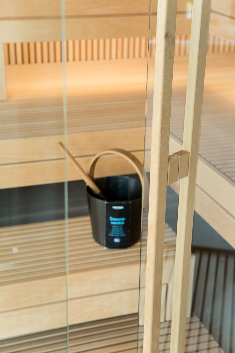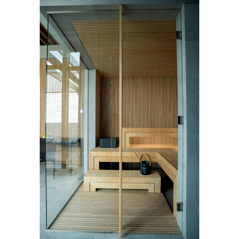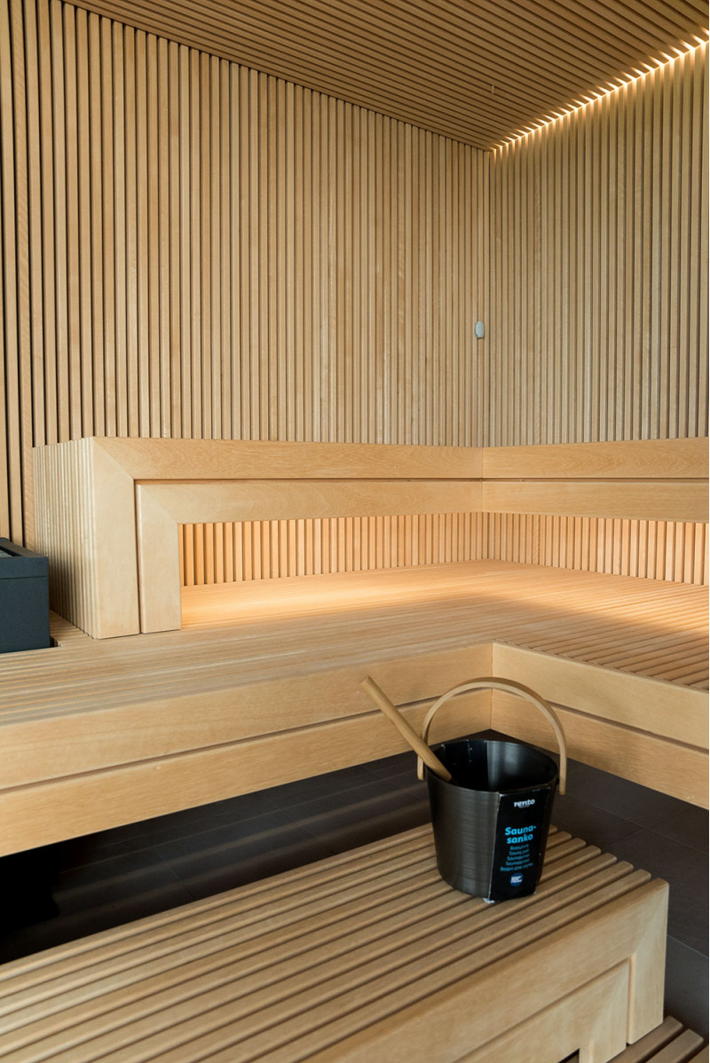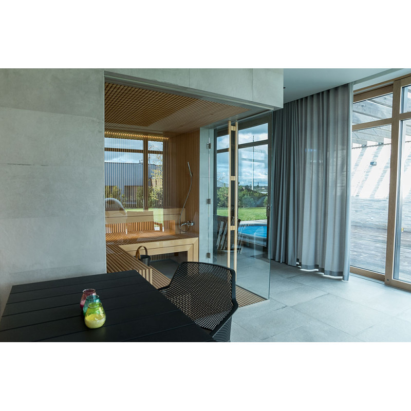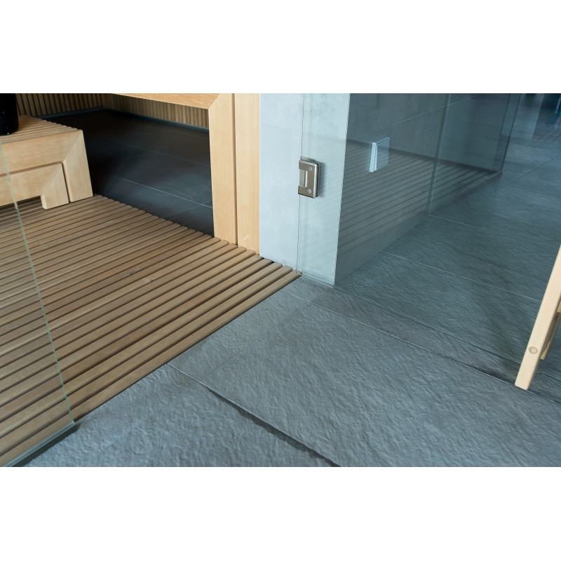 Le bois très léger choisi est l'abachi. Chaleur douce et faible. Cette caractéristique positive vous permet de profiter des plaisirs du sauna en tout confort. L'éclairage à fibre optique met en valeur la structure du bois. L'éclairage aménagé sous les transats et le plafond serpente horizontalement sur tout le mur et illumine confortablement les lames de bois ajourées.
