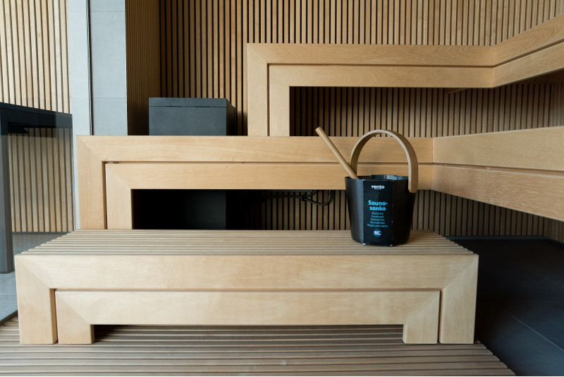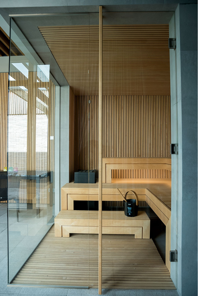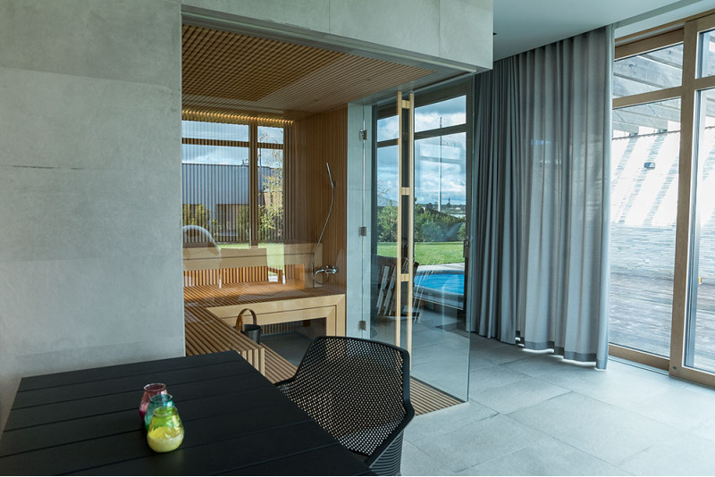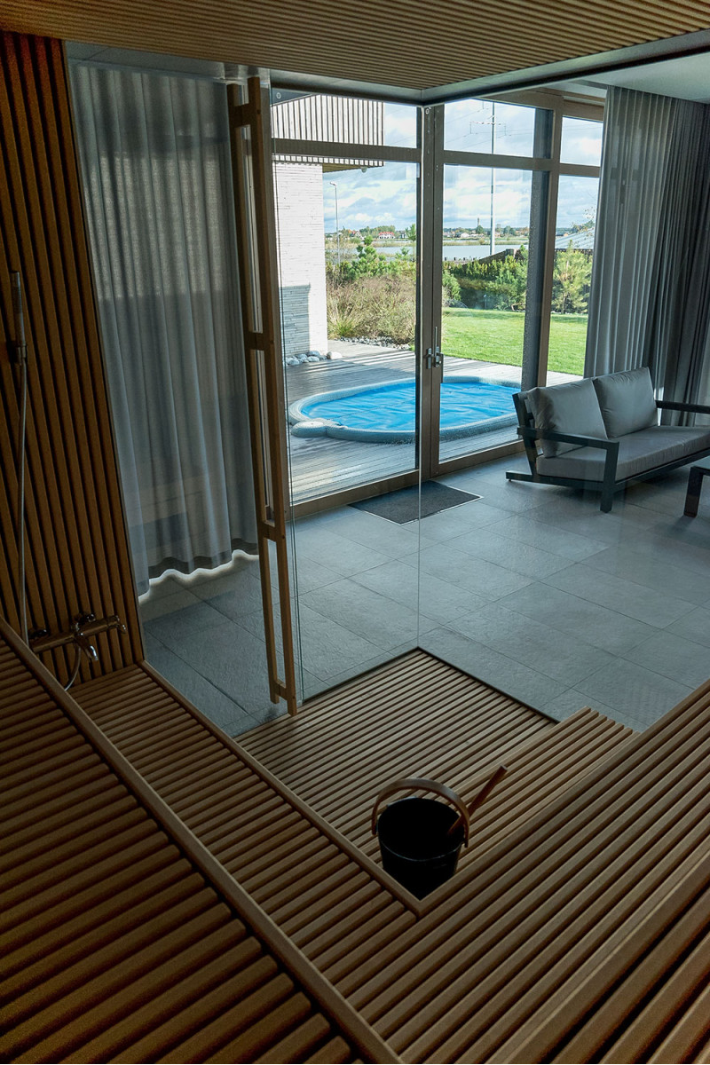 Le design exclusif de ce sauna est créé en décorant avec des bruxelles en bois ajouré. Des motifs de bois répétitifs ont également été utilisés dans le sauna. Un espace propre et harmonieux a été créé, il n'est pas divisé par une vitrine de sauna en verre, mais au contraire - il s'agrandit et ouvre la vue sur la nature merveilleuse.