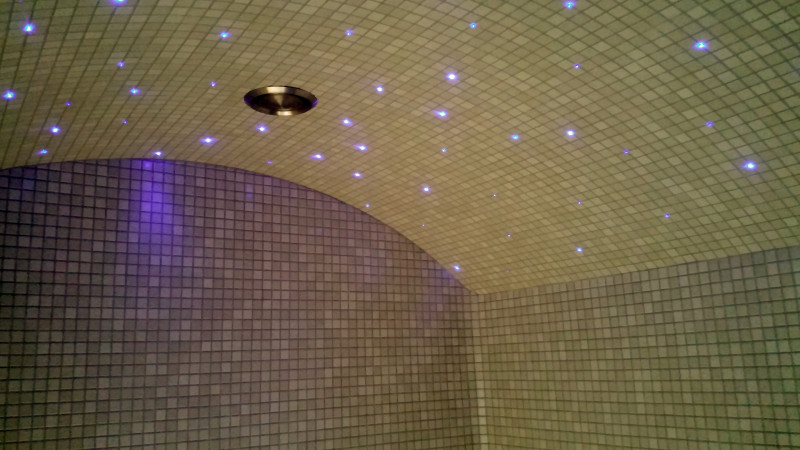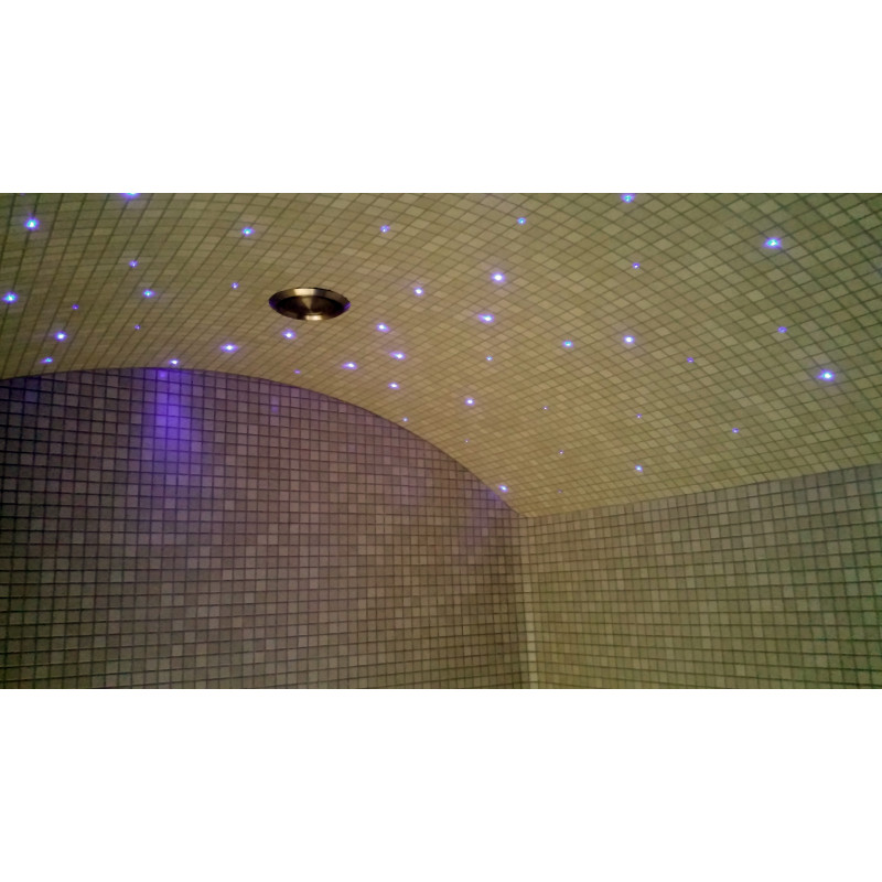 Le système d'éclairage est "ciel étoilé". Cet éclairage crée une vue impressionnante et confortable dans le sauna à vapeur. Sous les transats il y a un éclairage pour éclairer le sol.