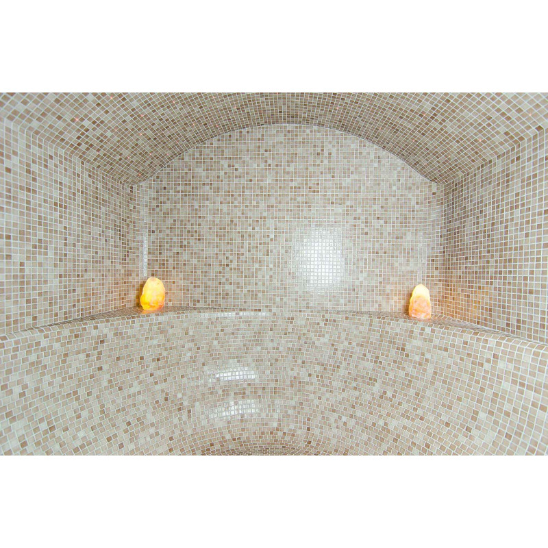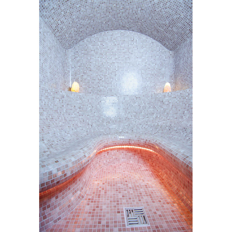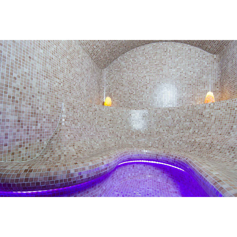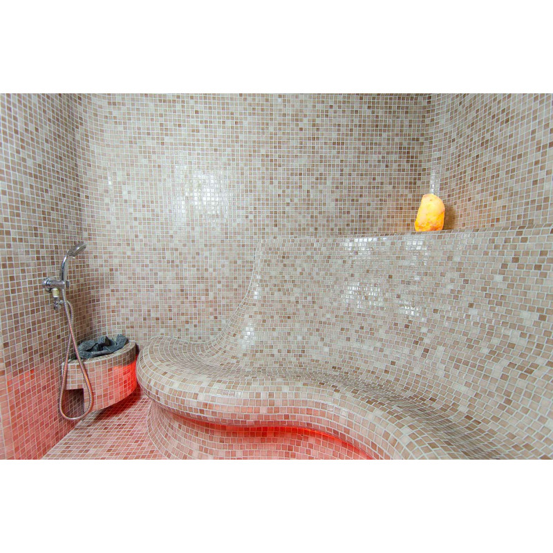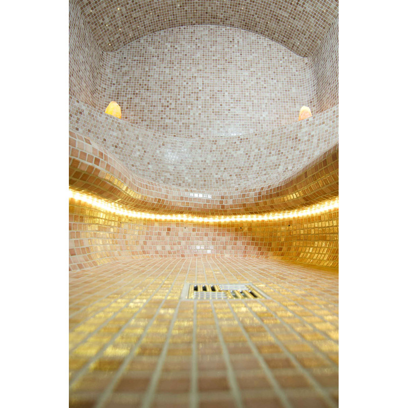 Finition - les sols, les murs, les plafonds et les bancs du sauna sont décorés de petits carreaux de mosaïque en verre concassé.