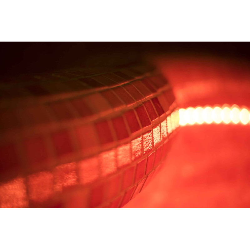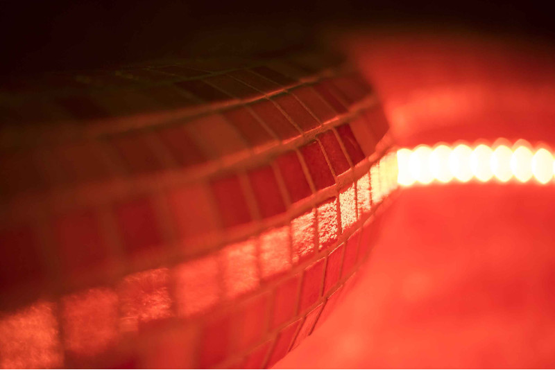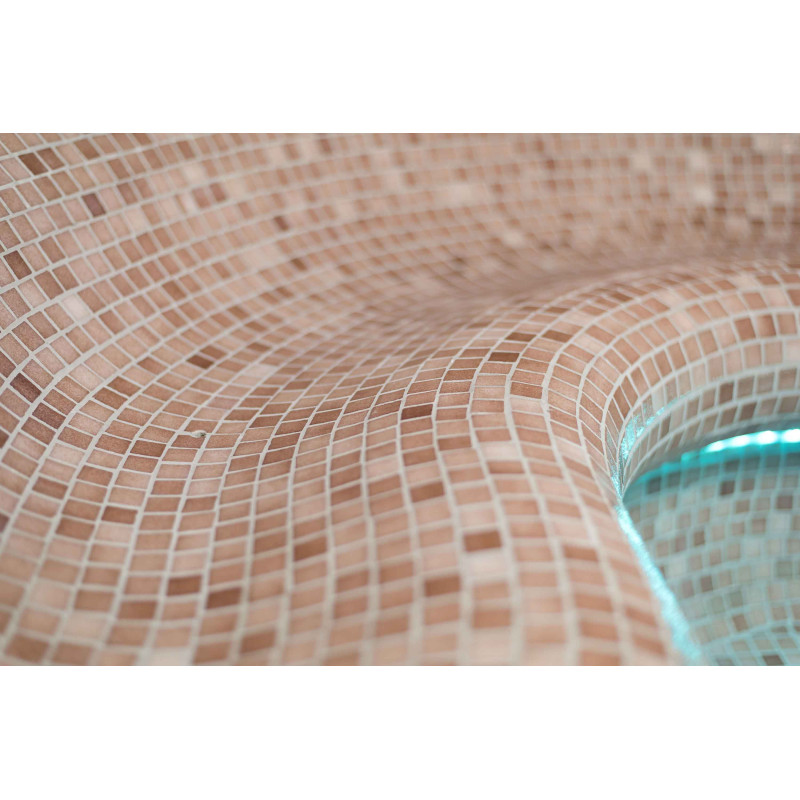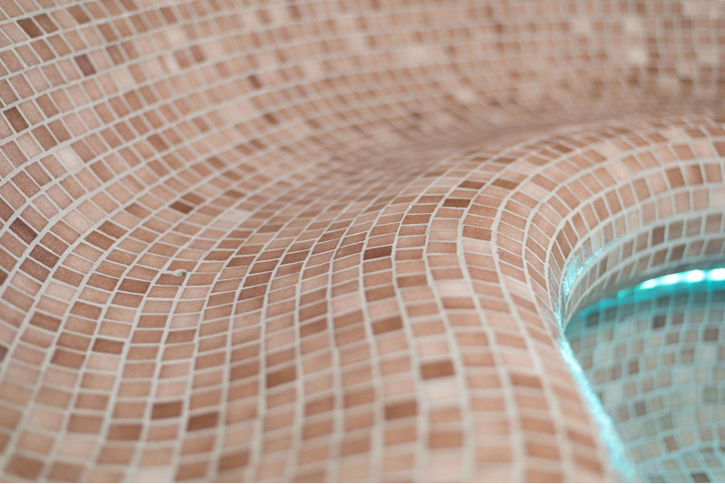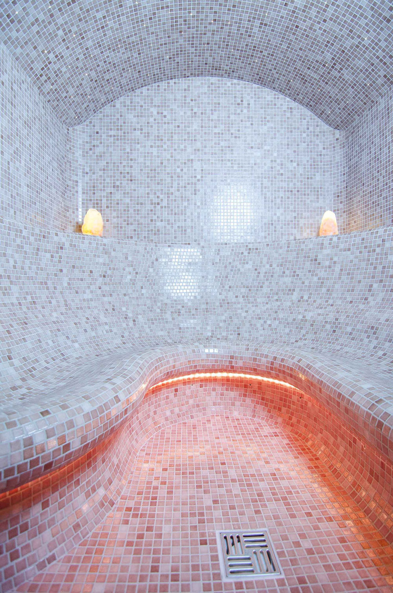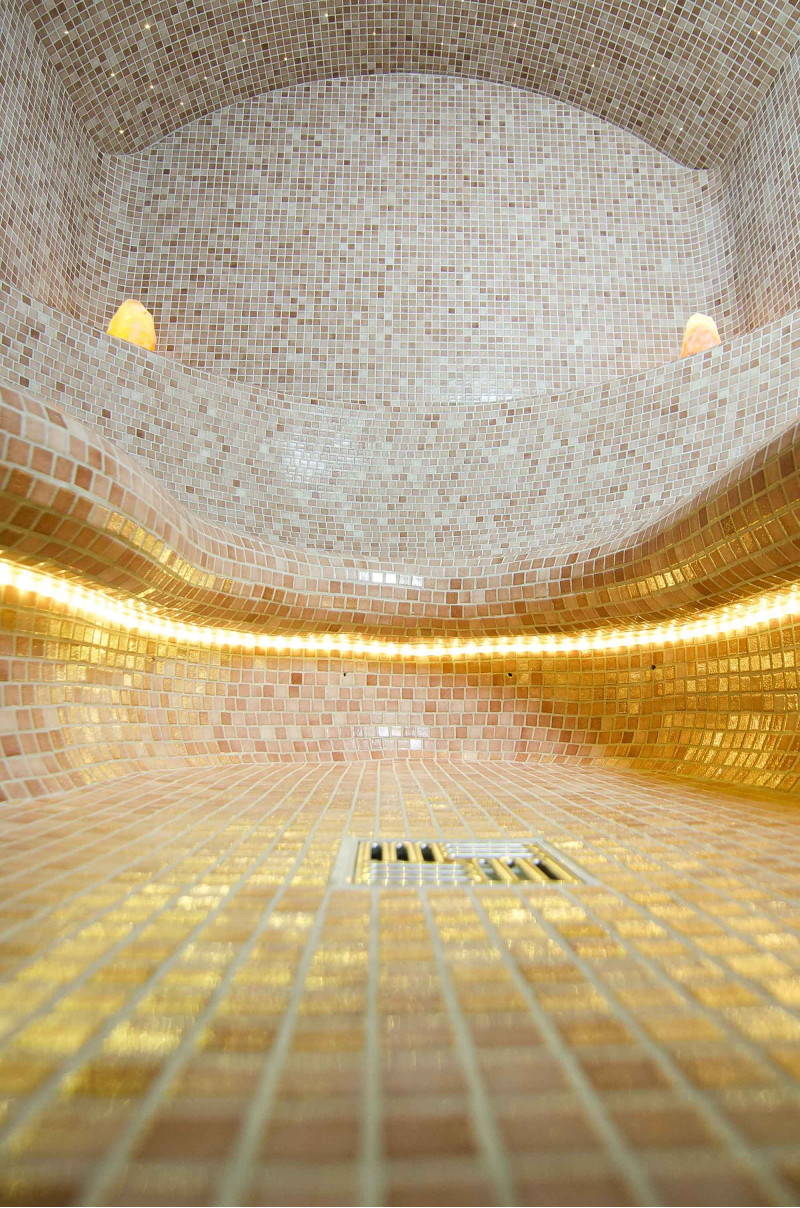 Finition - les sols, les murs, les plafonds et les bancs du sauna sont décorés de petits carreaux de mosaïque en verre concassé.