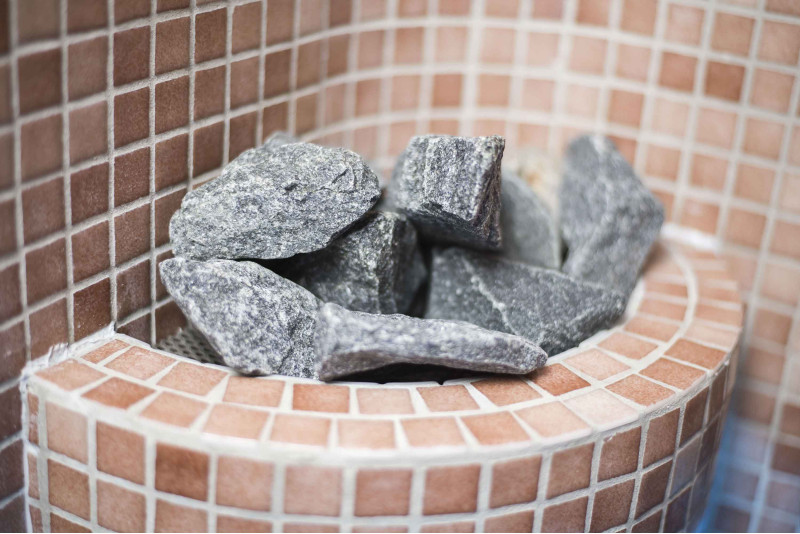Le sauna est équipé d'un vase à vapeur, qui remplit la fonction d'un tuyau de protection contre la vapeur, à travers lequel la vapeur pénètre dans le sauna. Décoré de pierres de diabase olivine.