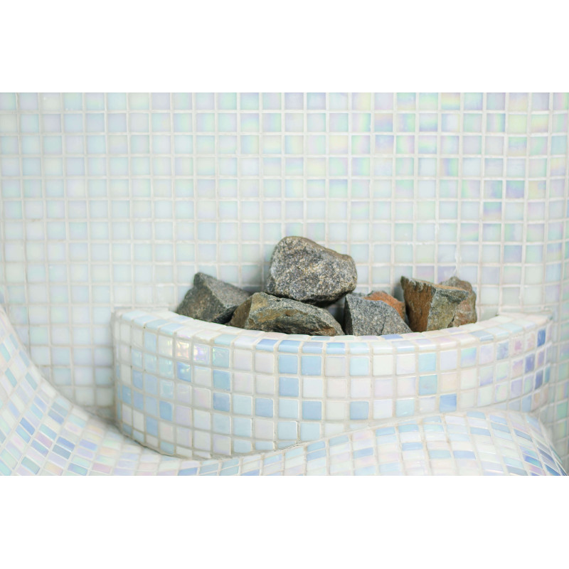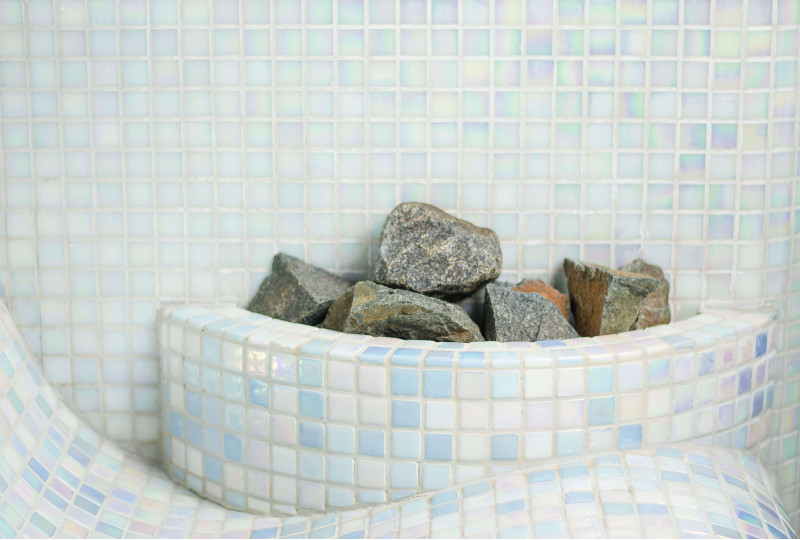 Le sauna dispose également d'un vase à vapeur, qui agit comme un tube de protection contre la vapeur à travers lequel la vapeur pénètre dans le sauna. Le vase est décoré de pierres de diabase olivine.