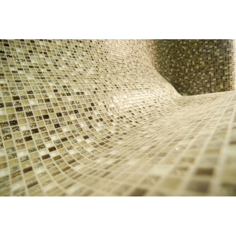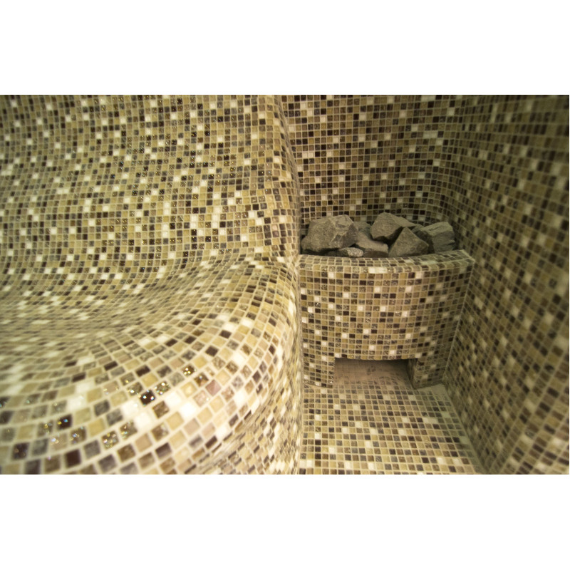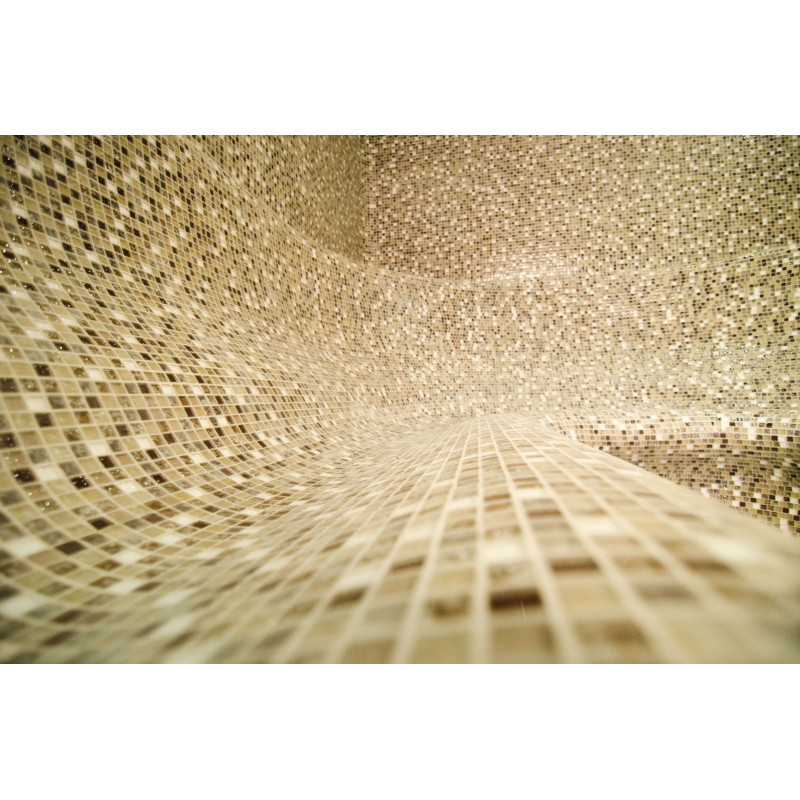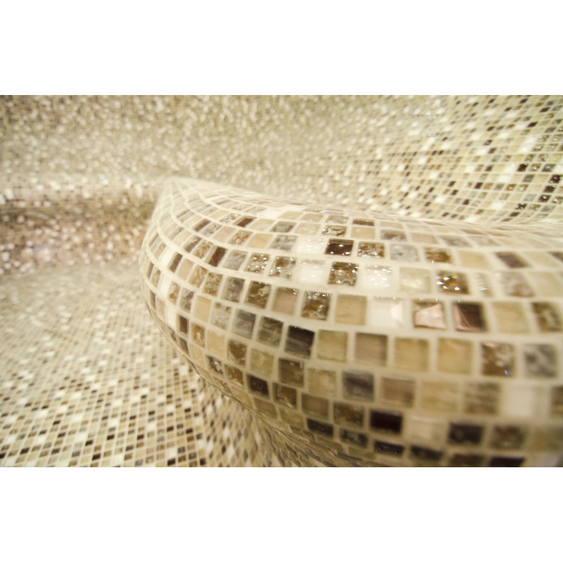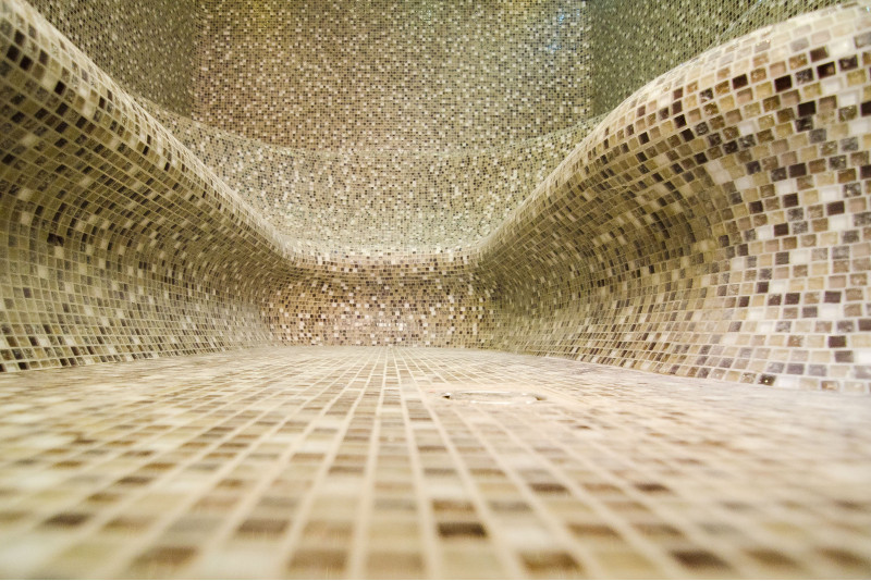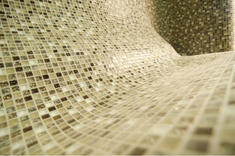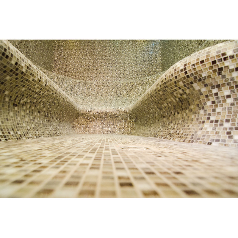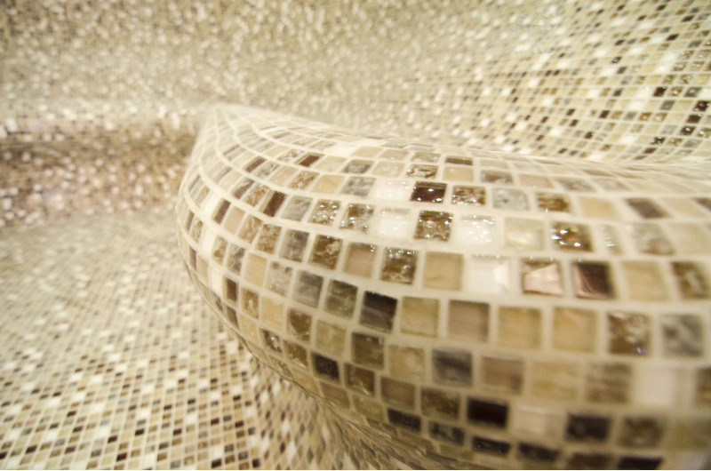 Finition - murs, bancs, sols décorés de petites mosaïques, carreaux de couleur naturelle.