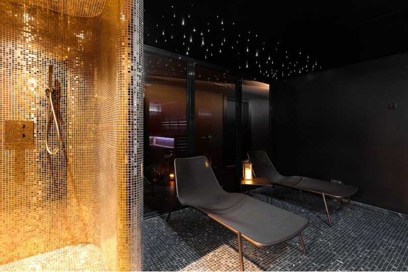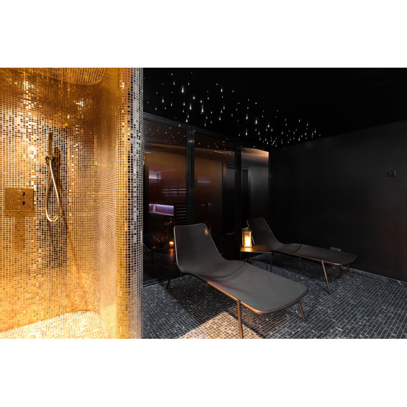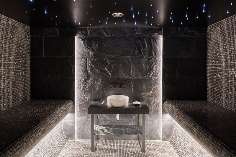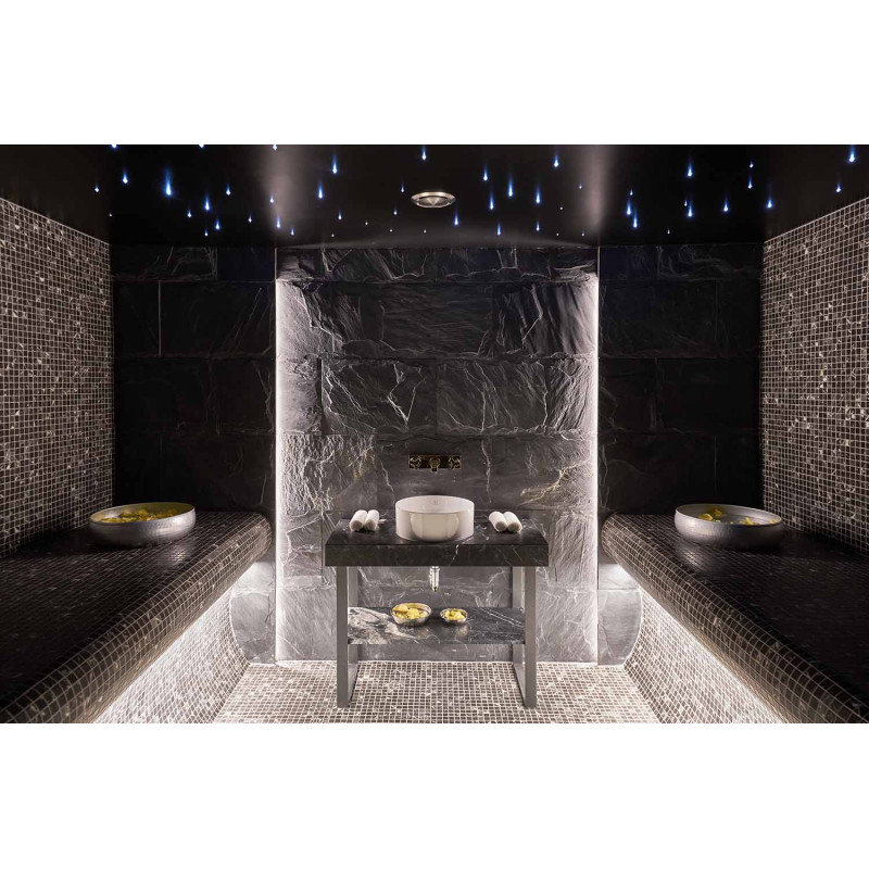Créant un style homogène, une vitrine en verre a également été choisie pour la salle du hammam. Les surfaces internes sont formées selon un projet individuel en polystyrène expansé à l'aide de styrène EPS à coupe continue. Les murs, les sols et les bancs de la pièce sont chauffés. Le système d'éclairage utilise des LED RGB IP 67, des bandes de 9m et un système de fibre optique "Starry Sky". Mosaïques collées, adaptées à la courbure et remplies d'imperméabilisation Schonox grise.