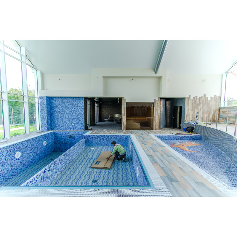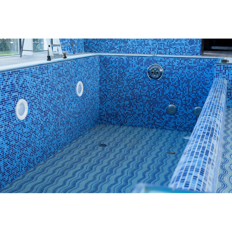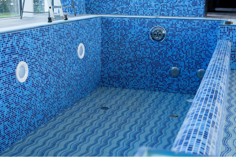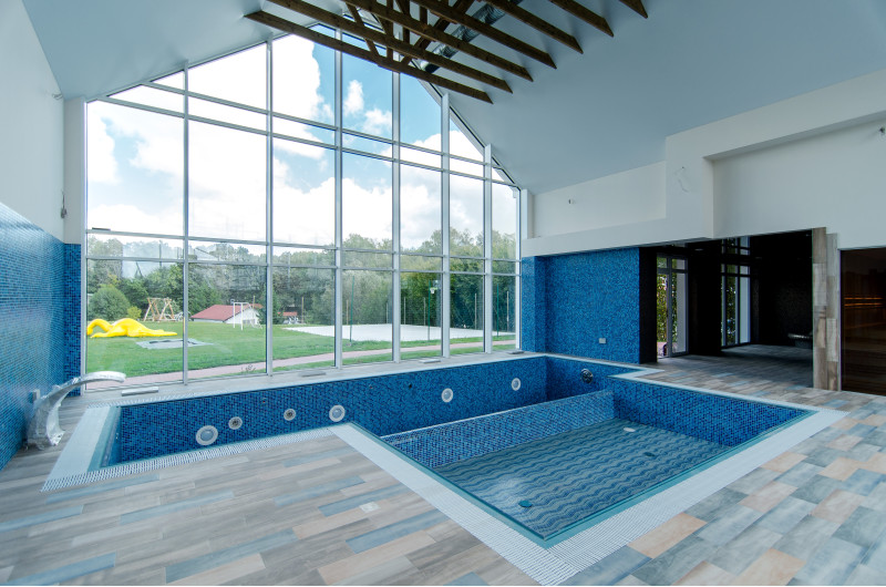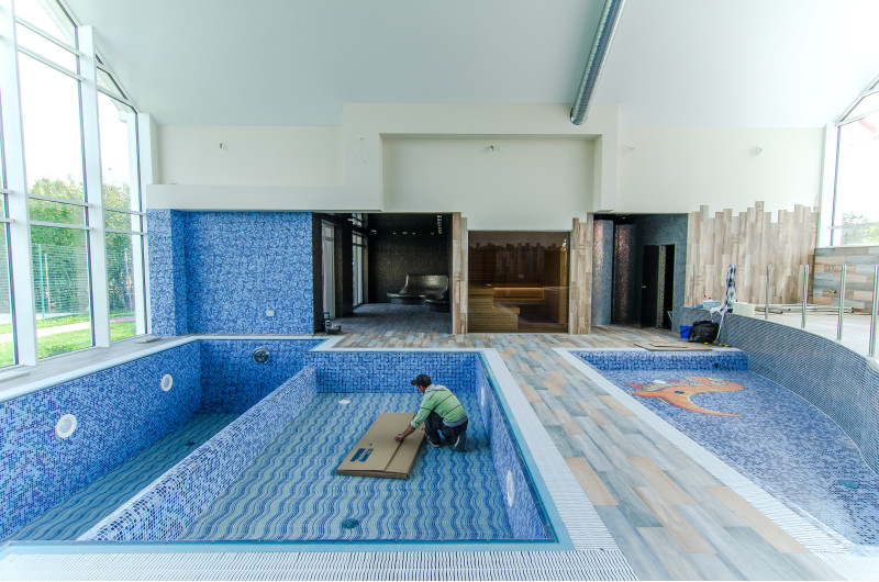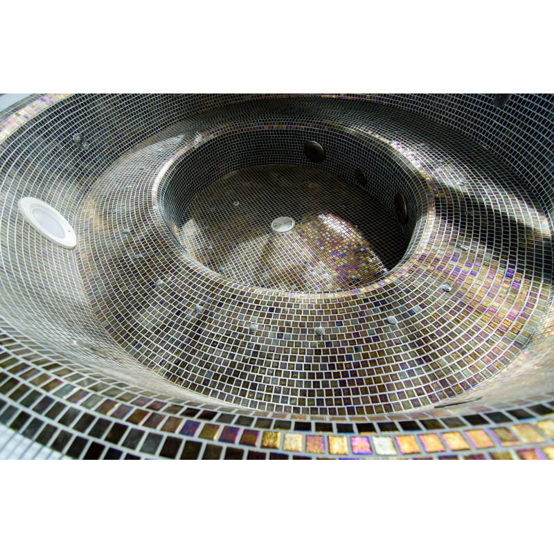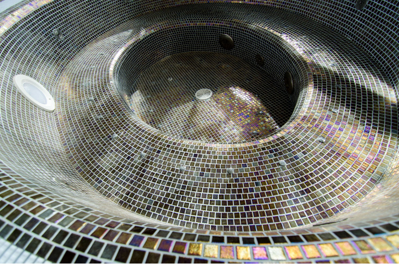 Piscine d'hydromassage - 8 places. Equipé de béton. L'intérieur est recouvert de carreaux de mosaïque. Luminaire sous-marin à LED, jets de massage, équipement de filtration, équipement de dosage automatique de produits chimiques.