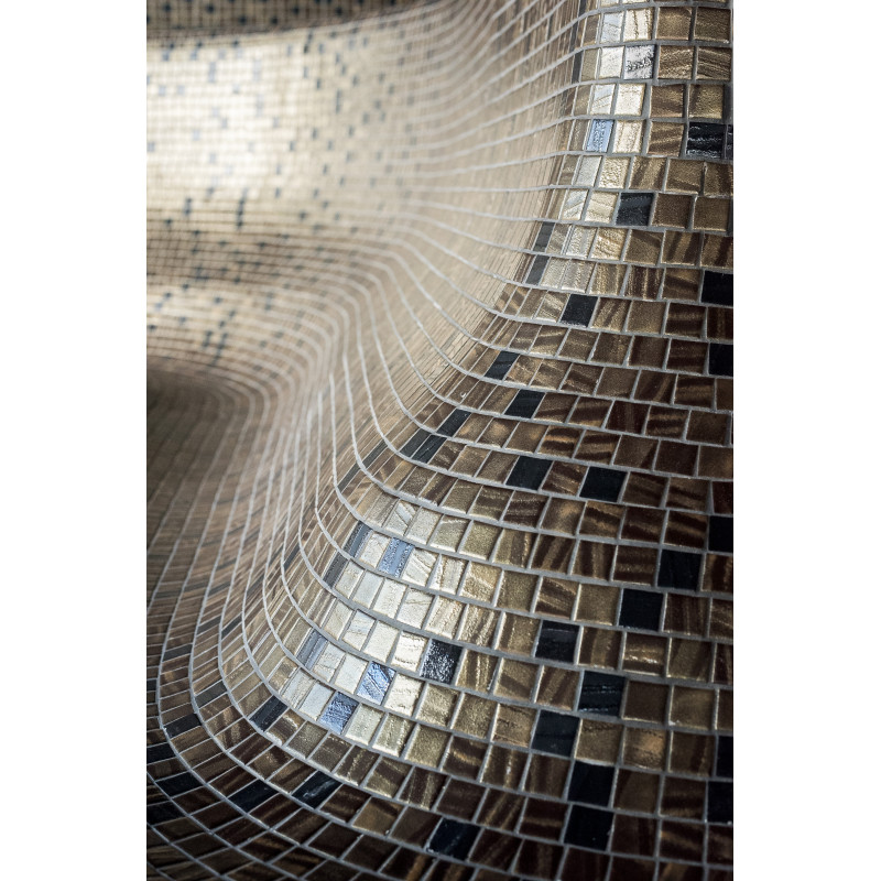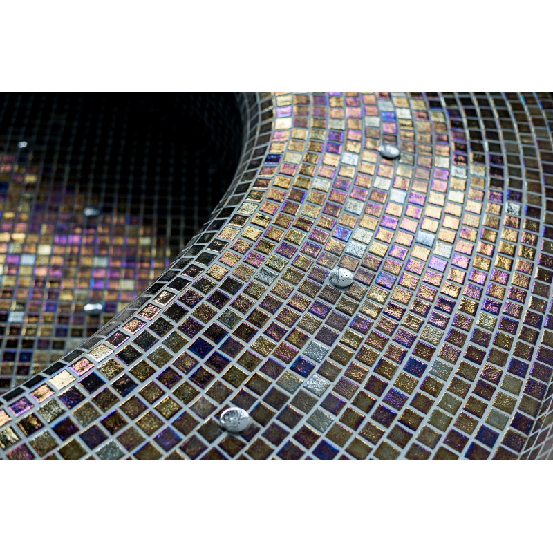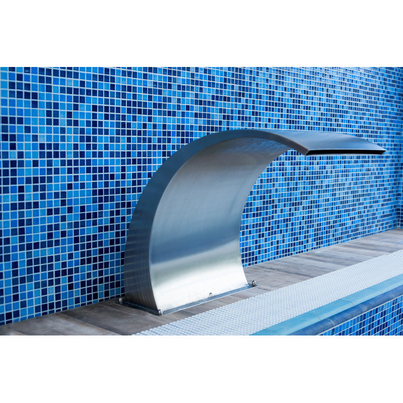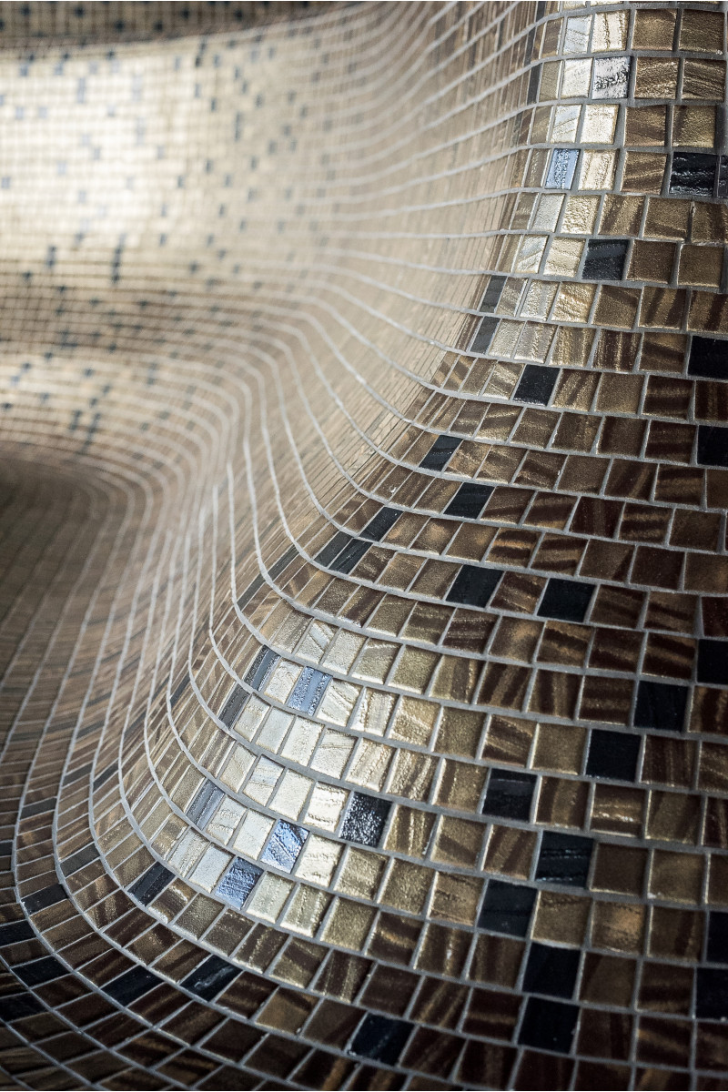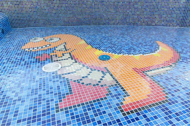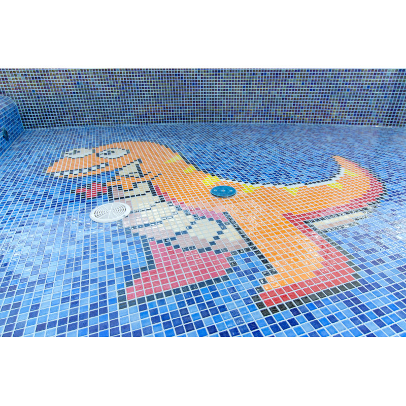 La piscine de 15 cm de profondeur est conçue pour les plus petits passionnés d'eau. Son fond est décoré d'un dessin en mosaïque colorée.