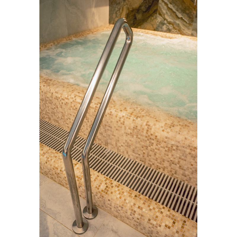 La piscine est équipée d'un jet de nage Taifun Duo, complet avec pompe, main courante, tuyauterie et commande pneumatique.