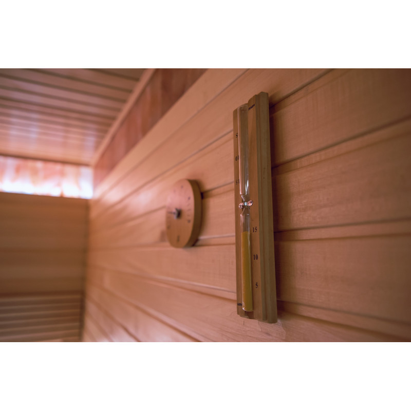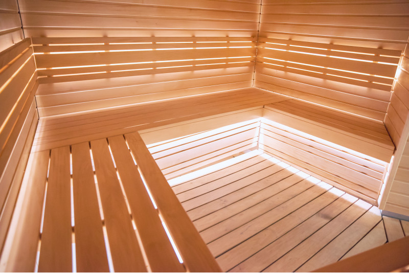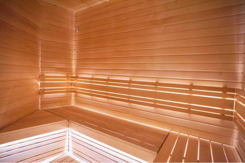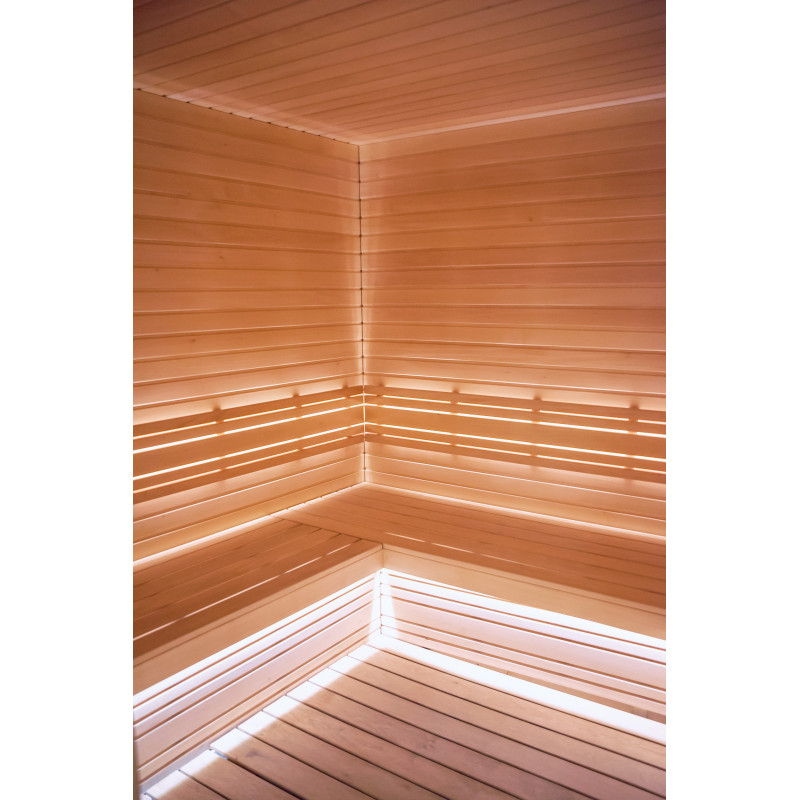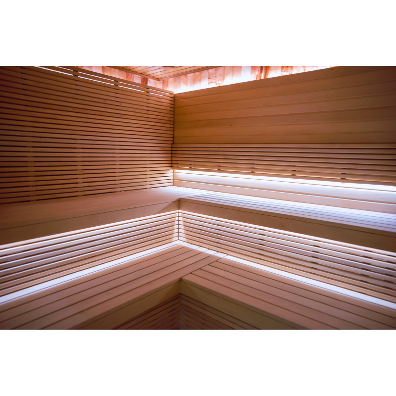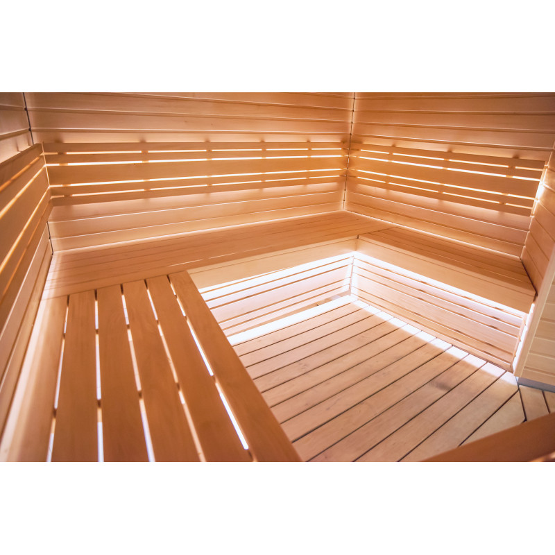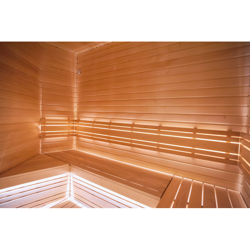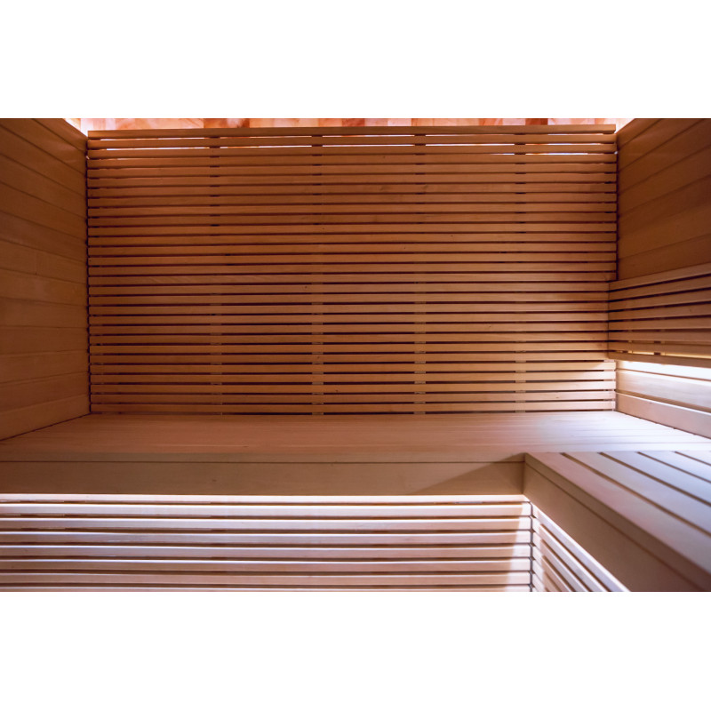 Le sauna est équipé d'équipements de ventilation, d'éclairage LED sous les couchettes supérieures et dans les supports du dos.
