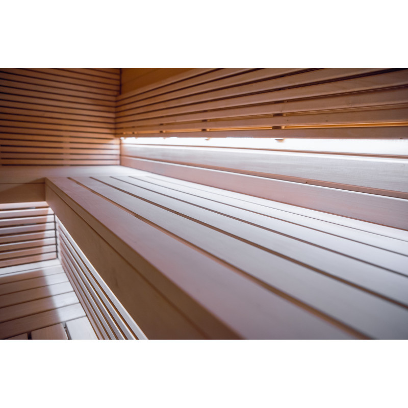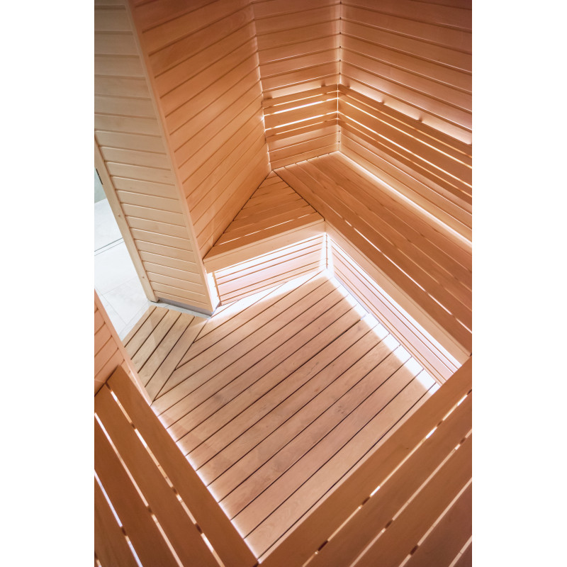 Du bois de tilleul de type A a été utilisé pour les lits de sauna, les supports de dos, le plafond du sauna et les panneaux muraux. La grille de sol est en bois d'aulne noir.
