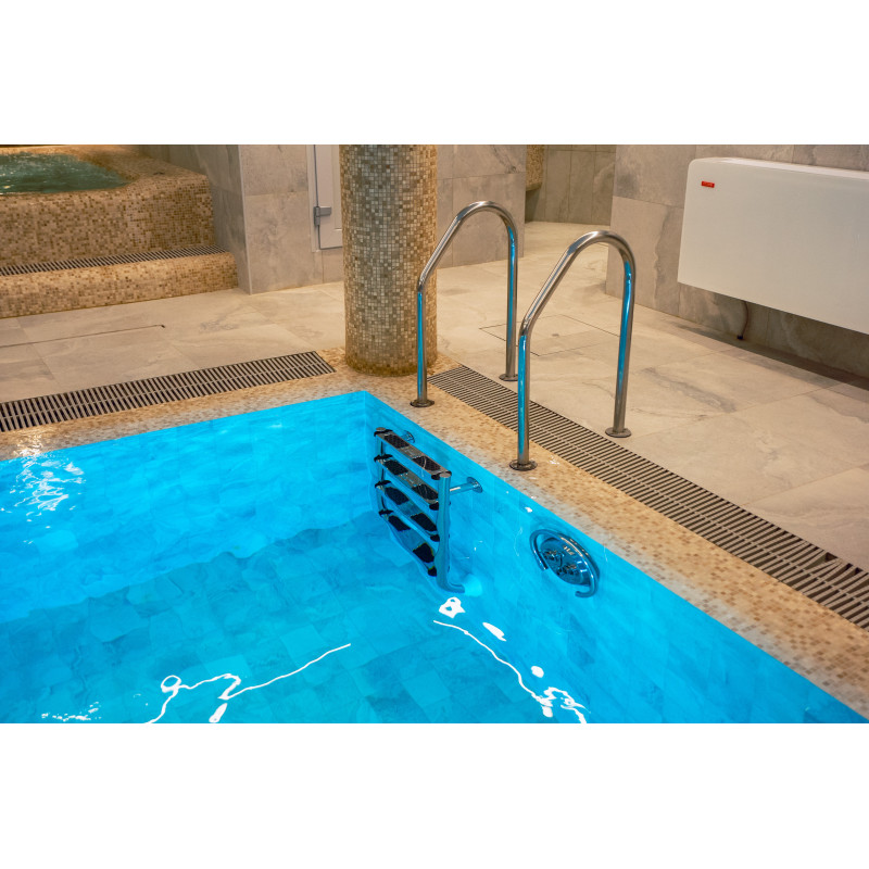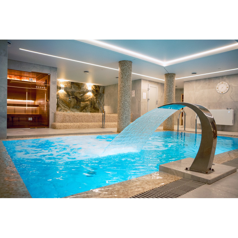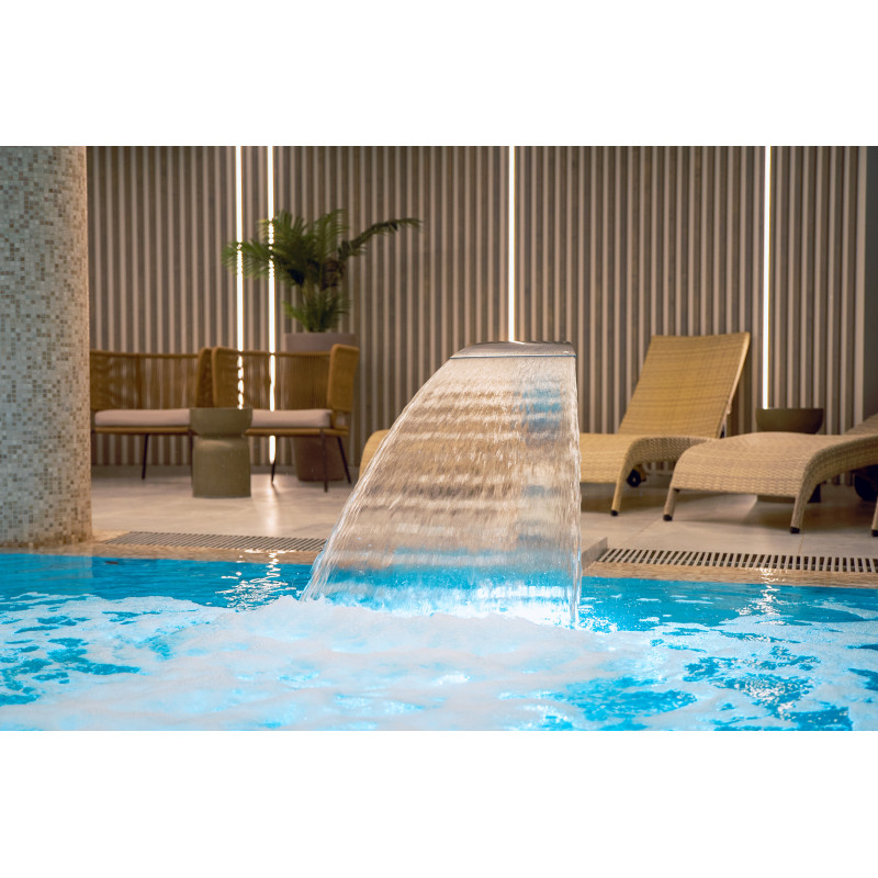 filtres, pompe de circulation, pompe de massage, station de dosage chimique automatique, chauffe-eau, stérilisateur UV, projecteur sous-marin à LED, doubles jets eau-air, jets de massage à air, grille de débordement, couverture de piscine, etc.