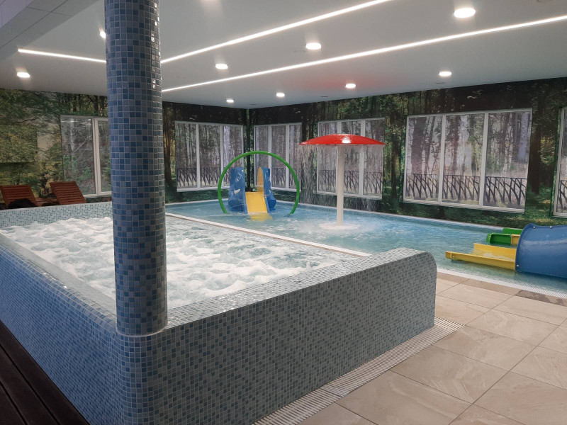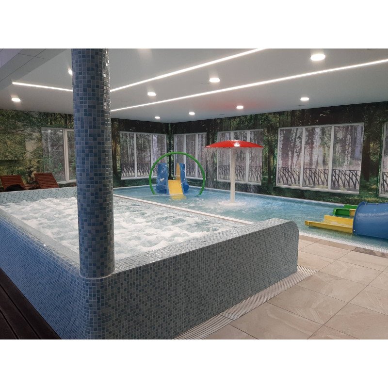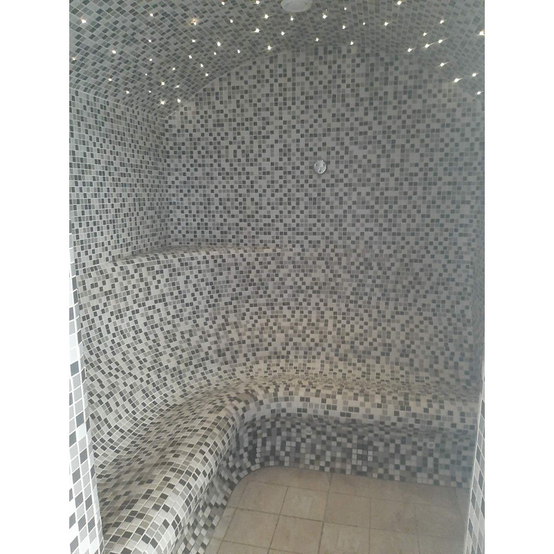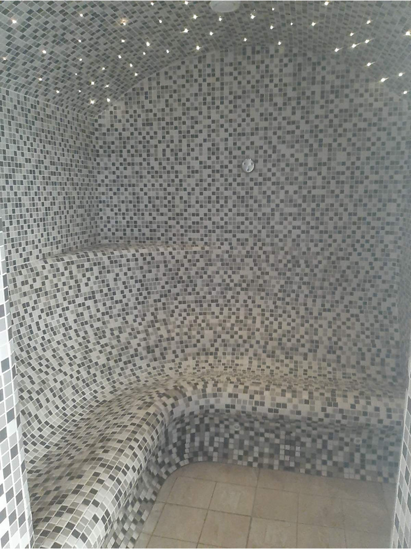 - Sauna à vapeur - matériaux utilisés pouvant résister à des températures extrêmement élevées et à une humidité très élevée. Le plafond est en forme d'arc afin que le condensat de vapeur ne s'égoutte pas sur les personnes profitant du sauna. Le carrelage a été choisi pour la décoration et l'éclairage par fibre optique pour le plafond, créant un effet de ciel étoilé. Les bancs sont dans une forme particulièrement confortable.