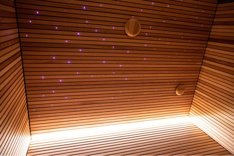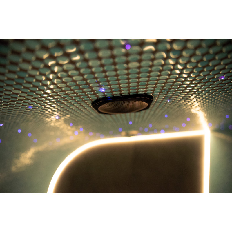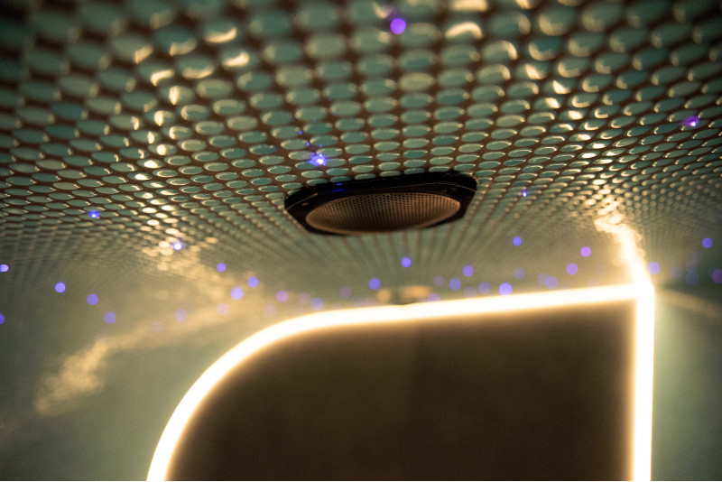 Une ambiance unique est créée par le système de fibre optique « Ciel étoilé » et l'éclairage LED à couleurs changeantes. Un éclairage LED supplémentaire est installé sous les bancs et le long du mur du fond.