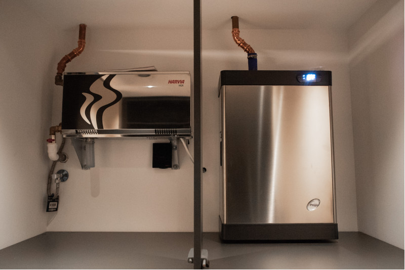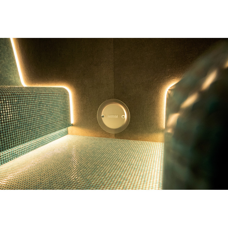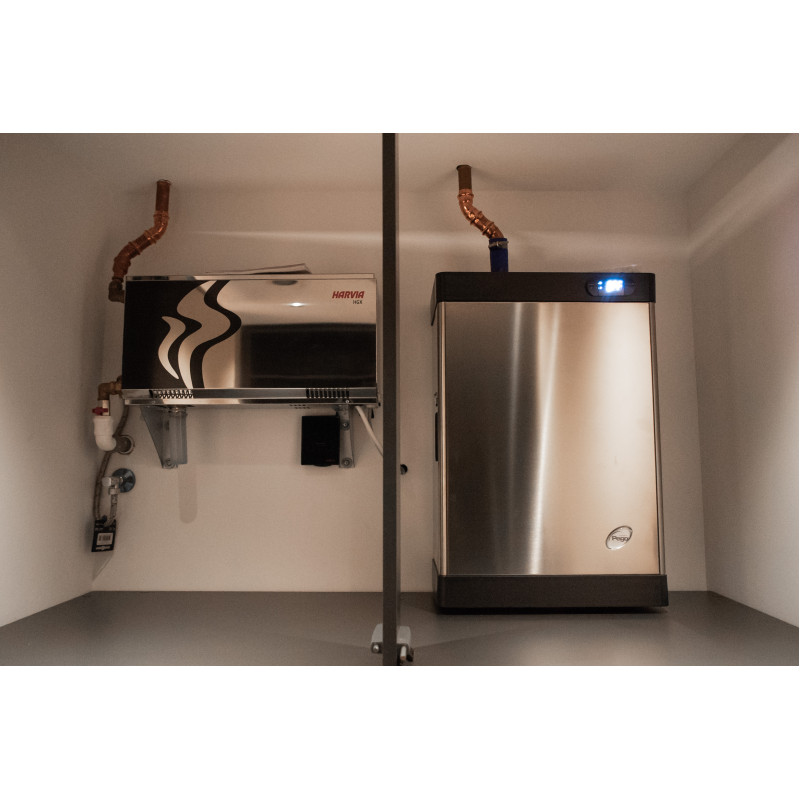 Buse à vapeur Harvia ZG-520 et générateur de vapeur PEGO ES12N (9 kW), commandés via le panneau de commande FCU 5000 avec capteur de température ;