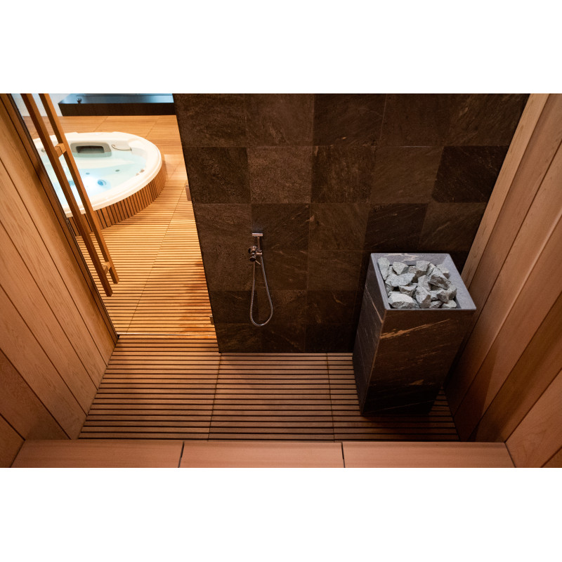 Dans tout l'espace SPA, le sol est composé de grilles en bois d'Iroko naturel , offrant à la fois durabilité et esthétique raffinée.