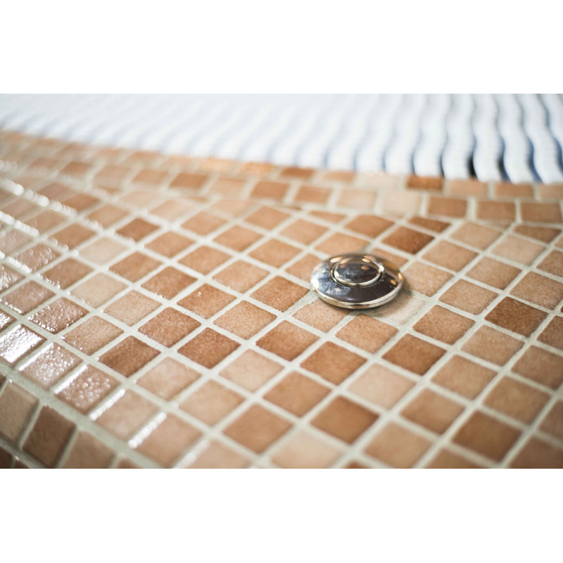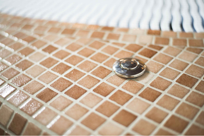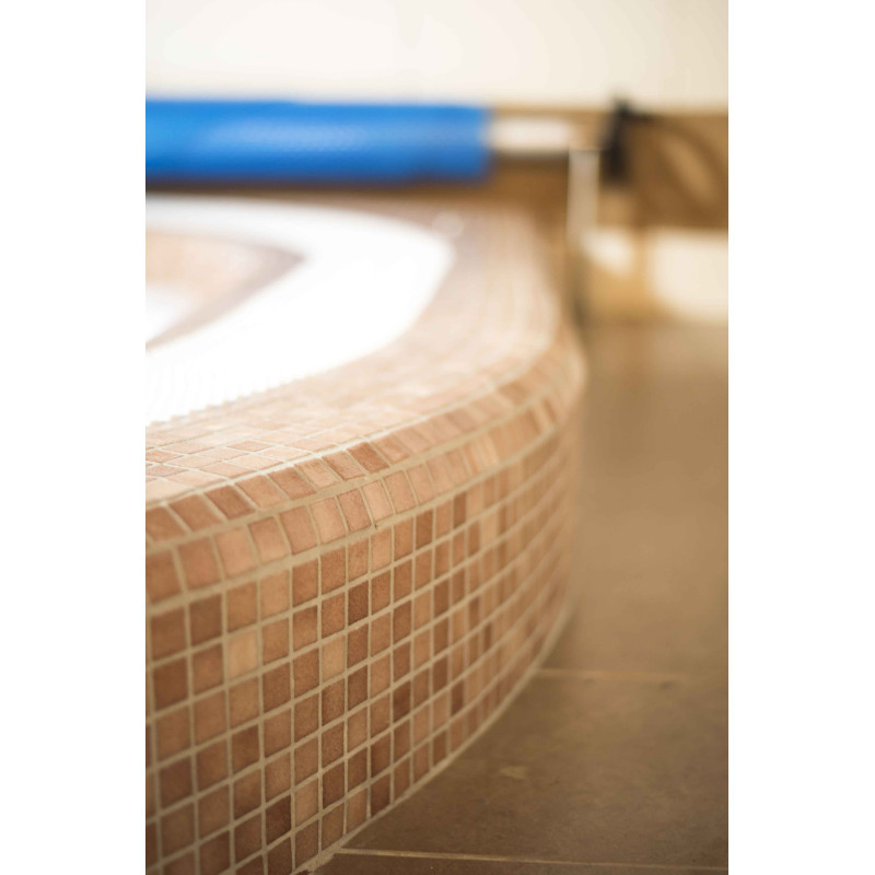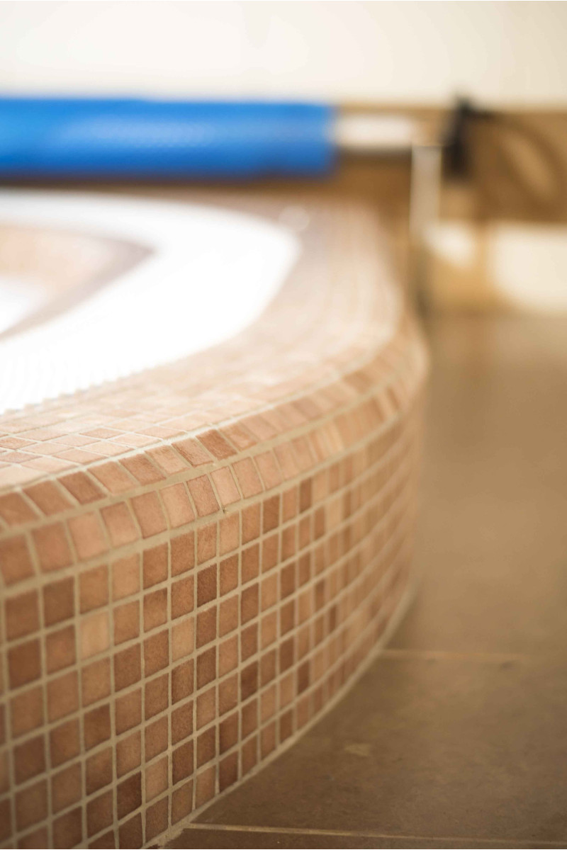 - Carrelage - l'intérieur et l'extérieur de la piscine sont recouverts de mosaïque de verre concassé de couleur neutre.
