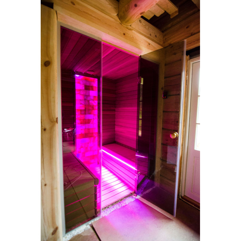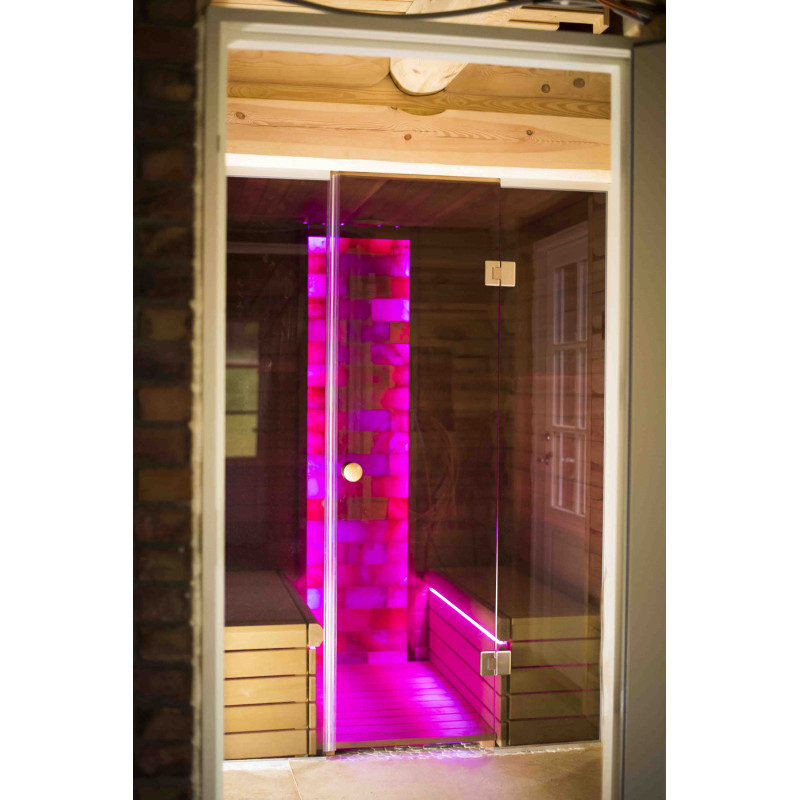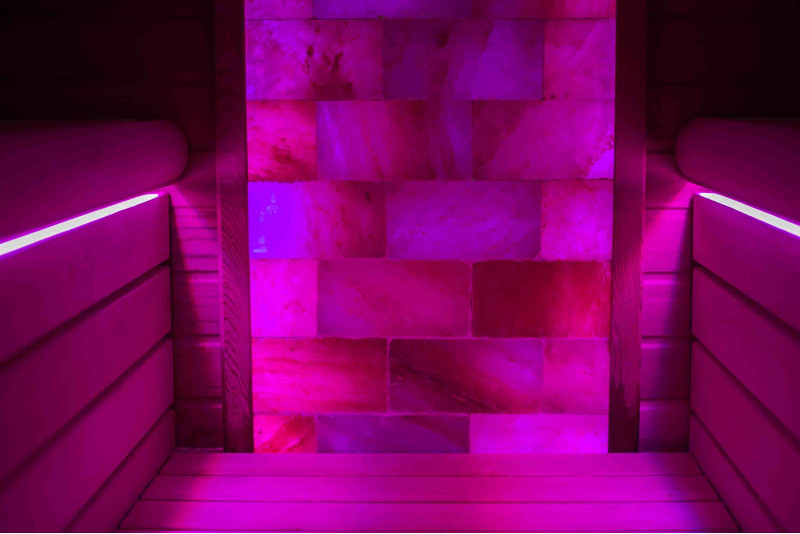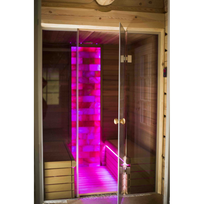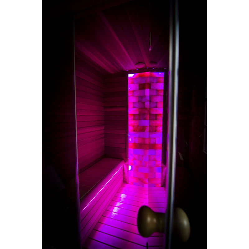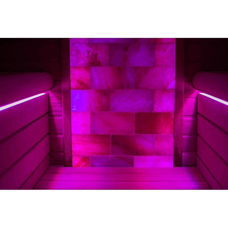 Le mur de briques de sel de l'Himalaya choisi pour la décoration du sauna avec l'éclairage RVB coloré intégré, contrôlé par un changeur de couleurs sans fil, crée un environnement confortable et améliore encore l'effet du sauna.
