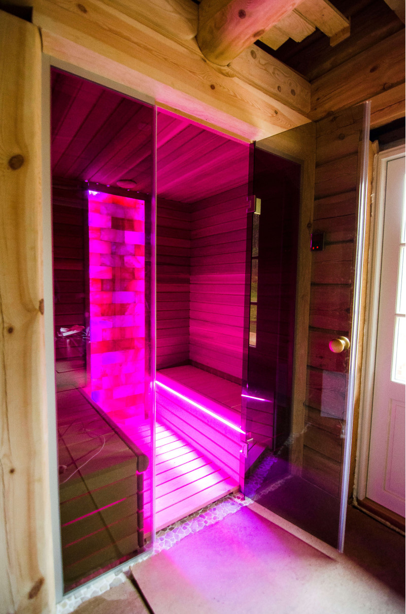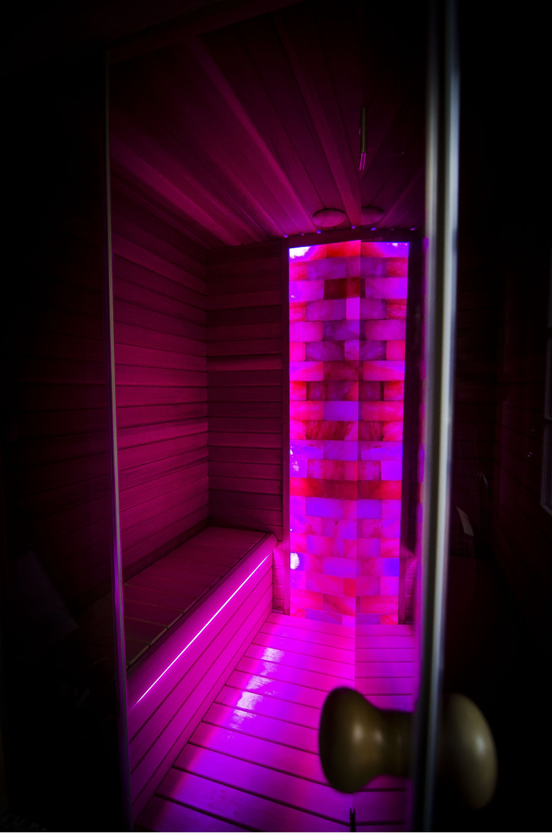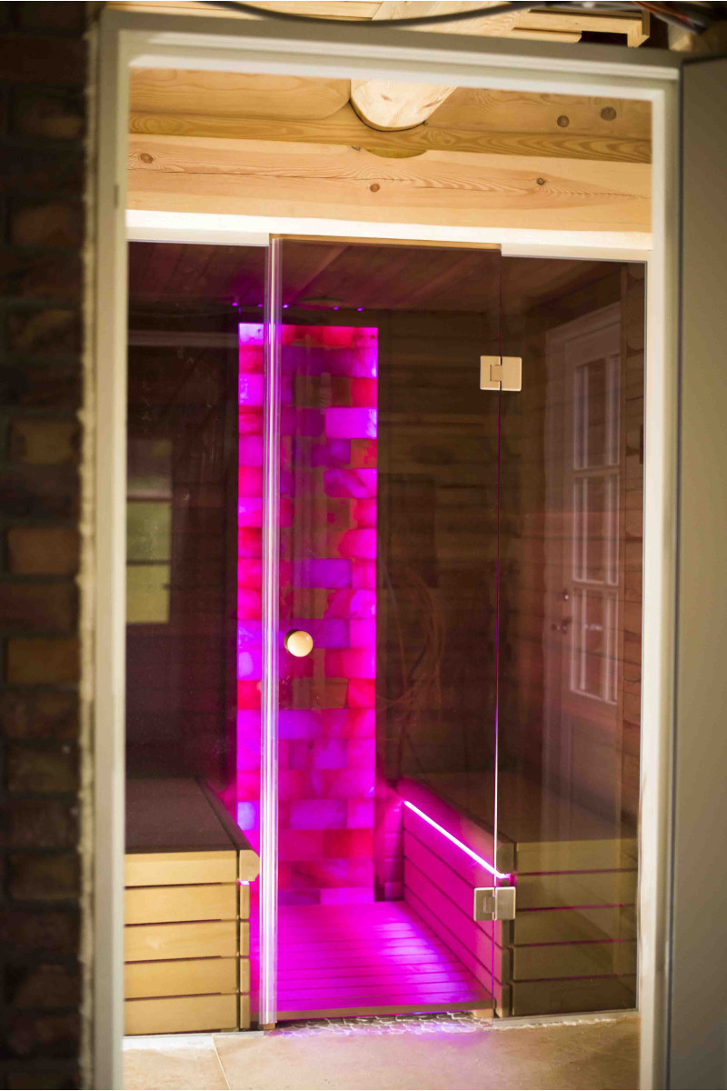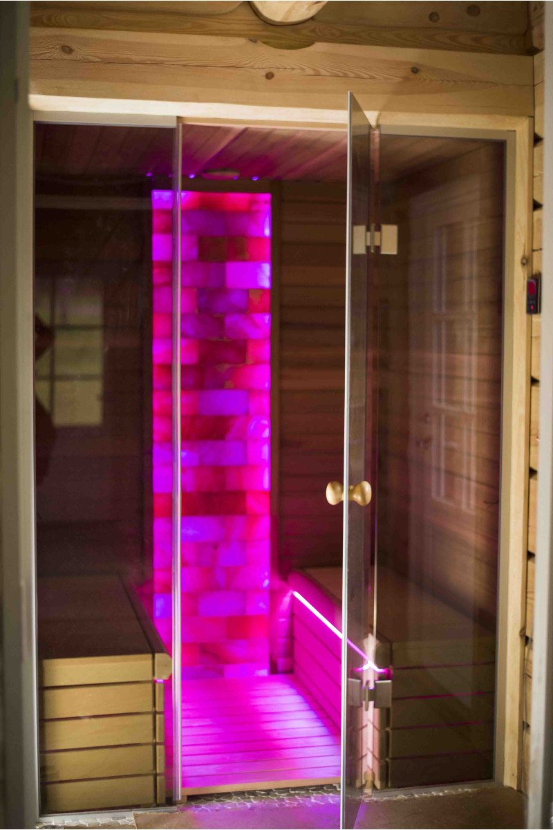 Le mur de briques de sel de l'Himalaya choisi pour la décoration du sauna avec l'éclairage RVB coloré intégré, contrôlé par un changeur de couleurs sans fil, crée un environnement confortable et améliore encore l'effet du sauna.