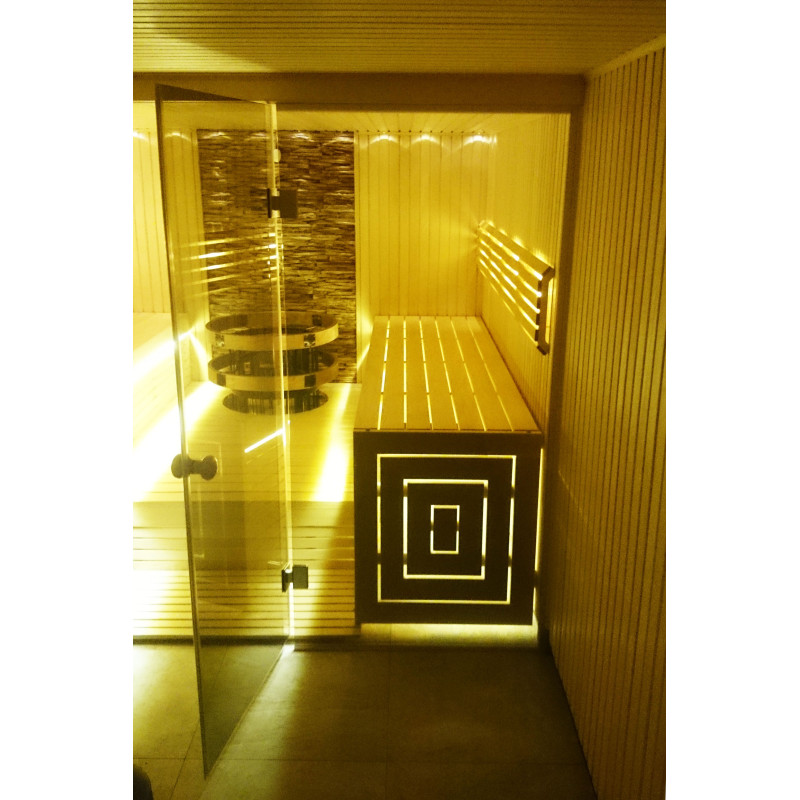 Bruxelles possède un sauna qui se démarque par son design et ses solutions techniques. Un projet individuel et peu encombrant a été proposé pour les petits saunas et les salles de bain. Les transats du sauna sont installés sur un podium, face à face, créant une belle ambiance de communication. Le poêle est encastré dans le sol avec des anneaux de protection. Le mur de briques décoratives est un accent exclusif, créant un environnement confortable et original. La vitrine en verre agrandit optiquement l'espace et complète le style ultra-moderne du sauna.