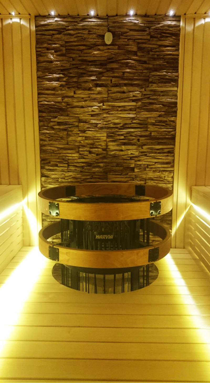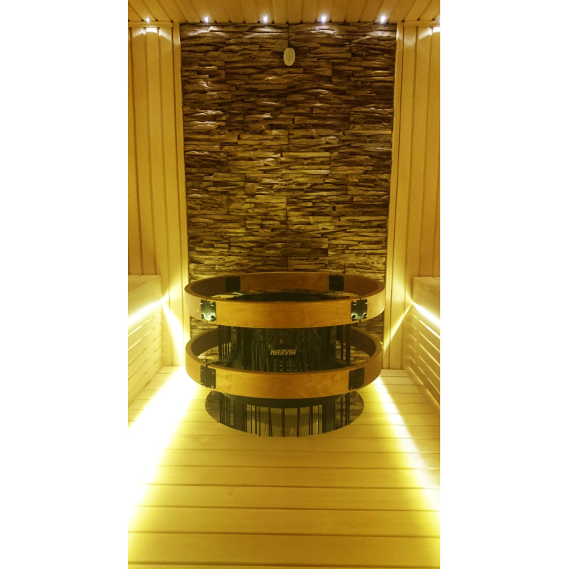 Chauffage - Harvia Legend, qui donne beaucoup de vapeur. Rempli d'une grande quantité de pierres de diabase d'olivine. Le chauffage est contrôlé par une console numérique Griffin, qui peut régler la température à un degré de précision.