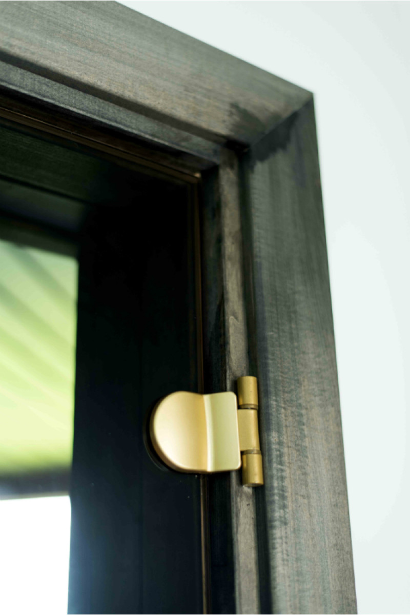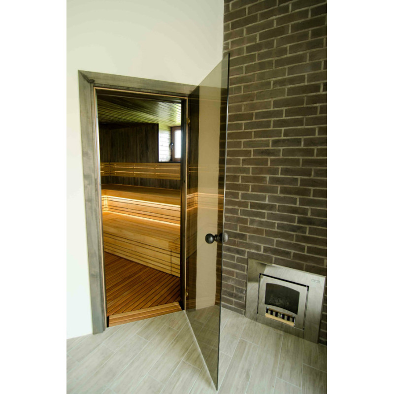 Portes avec verre teinté bronze trempé, cadre en bois de tilleul et poignée ronde.