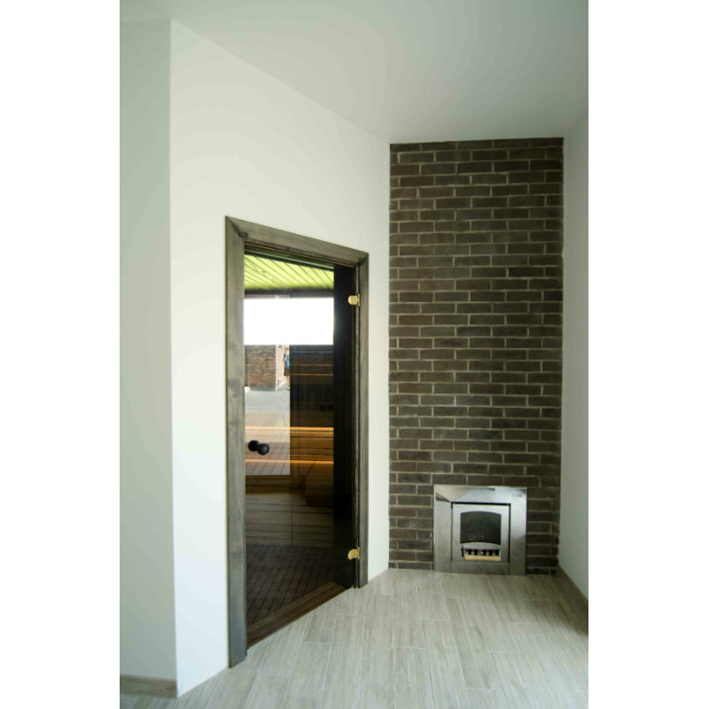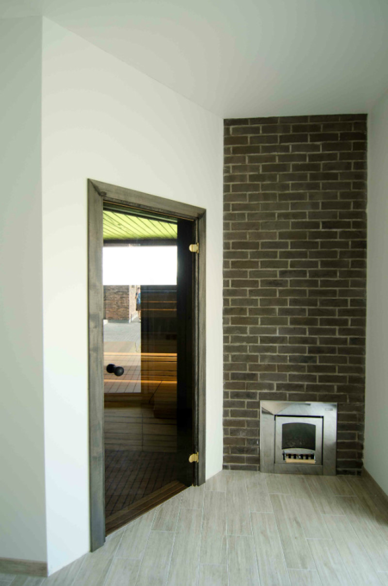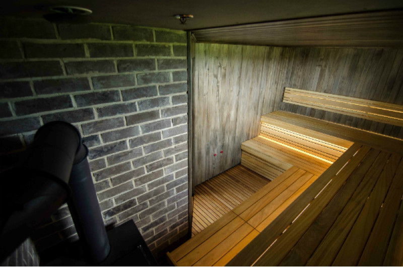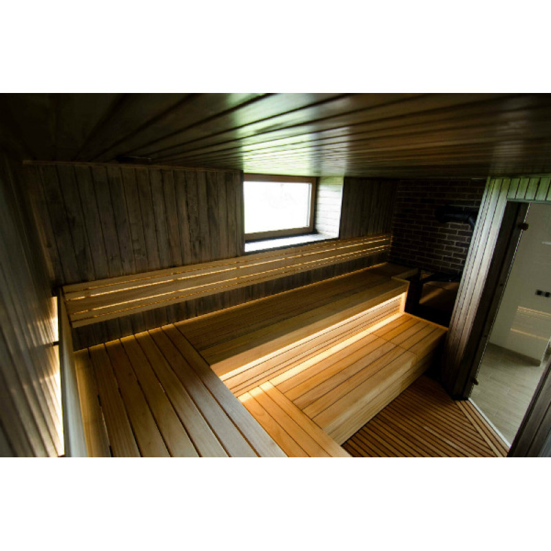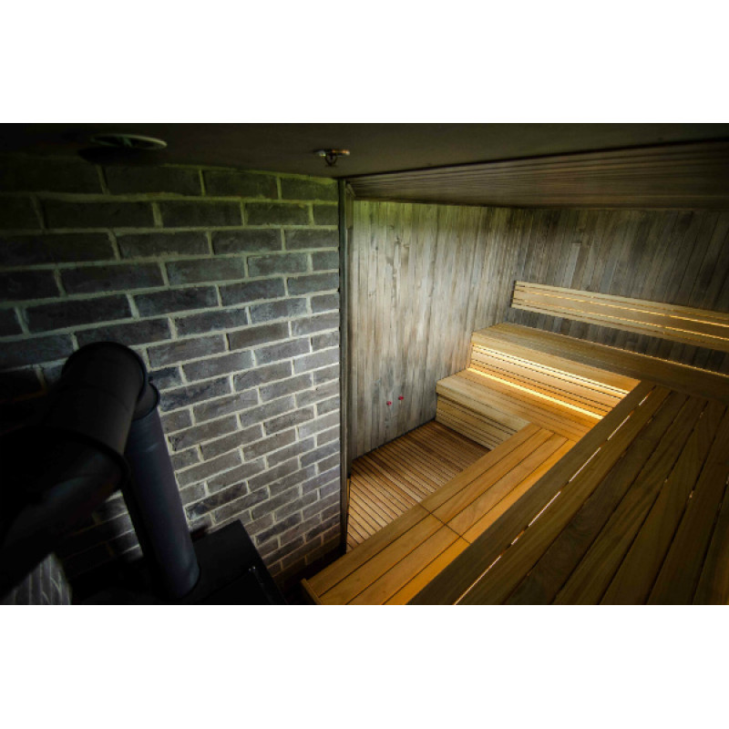 Les murs et le plafond, cirés avec une cire noire spéciale, contrastent avec les banquettes lumineuses du sauna, la pièce est unique, créant une atmosphère chaleureuse et moderne. Ce contraste des bancs et des murs est encore accentué par l'éclairage LED blanc intégré résistant à la température et à l'humidité sous les bancs et les dossiers.