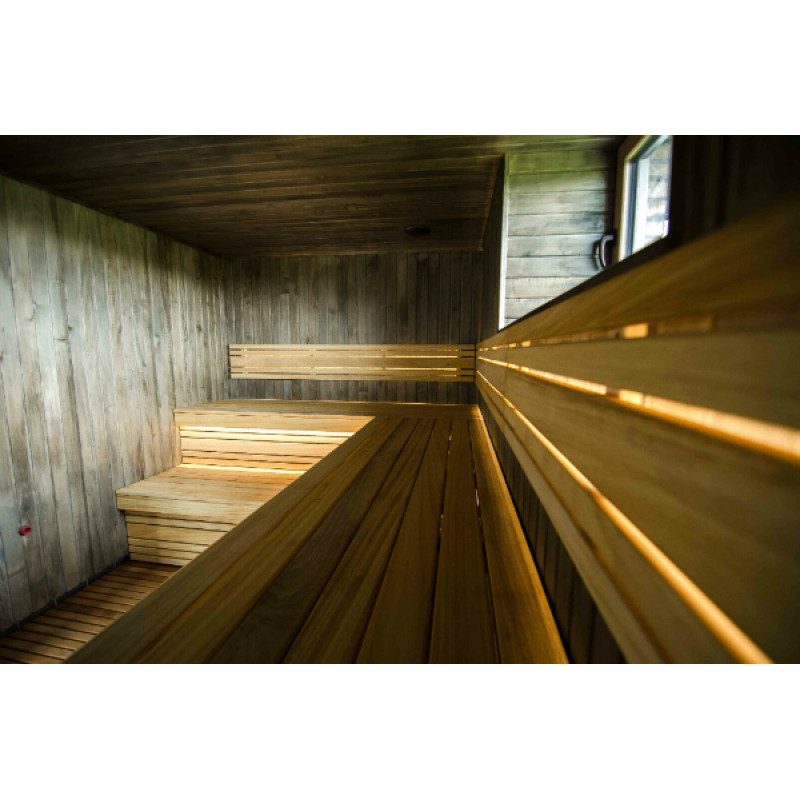 Le bois d'Abachi africain de haute qualité est choisi pour les chaises longues, les dossiers et les caillebotis du sauna. Non seulement ce bois a fière allure, mais il ne chauffe pas non plus, ce qui le rend impossible à brûler au toucher. Il est particulièrement pratique et agréable de profiter d'un sauna sur de tels bancs.