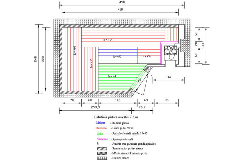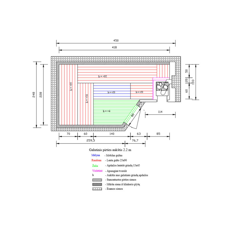 Revêtement de plafond et de mur - le type le plus élevé de bois de tilleul AB. Le bardage en tilleul a une faible capacité thermique, ce qui contribue au chauffage rapide du sauna. De plus, le bois de tilleul contient une grande quantité d'huiles essentielles, le bois dégage une agréable odeur naturelle dans le sauna.