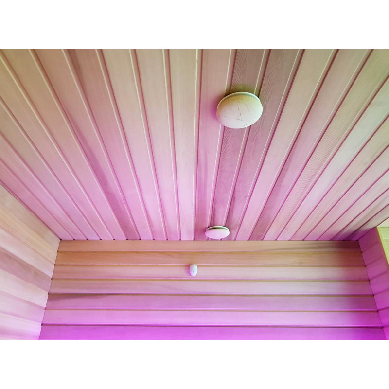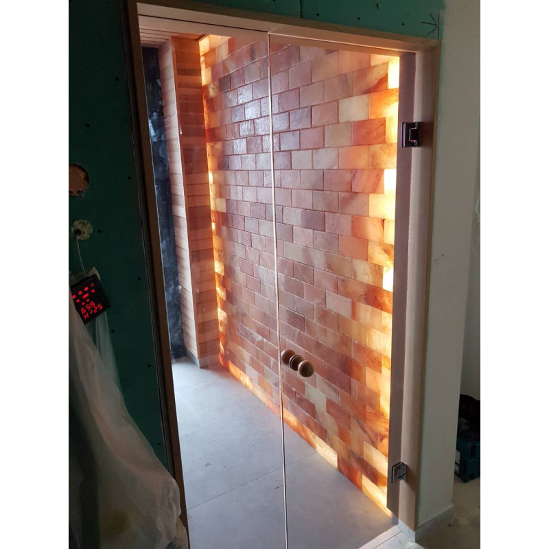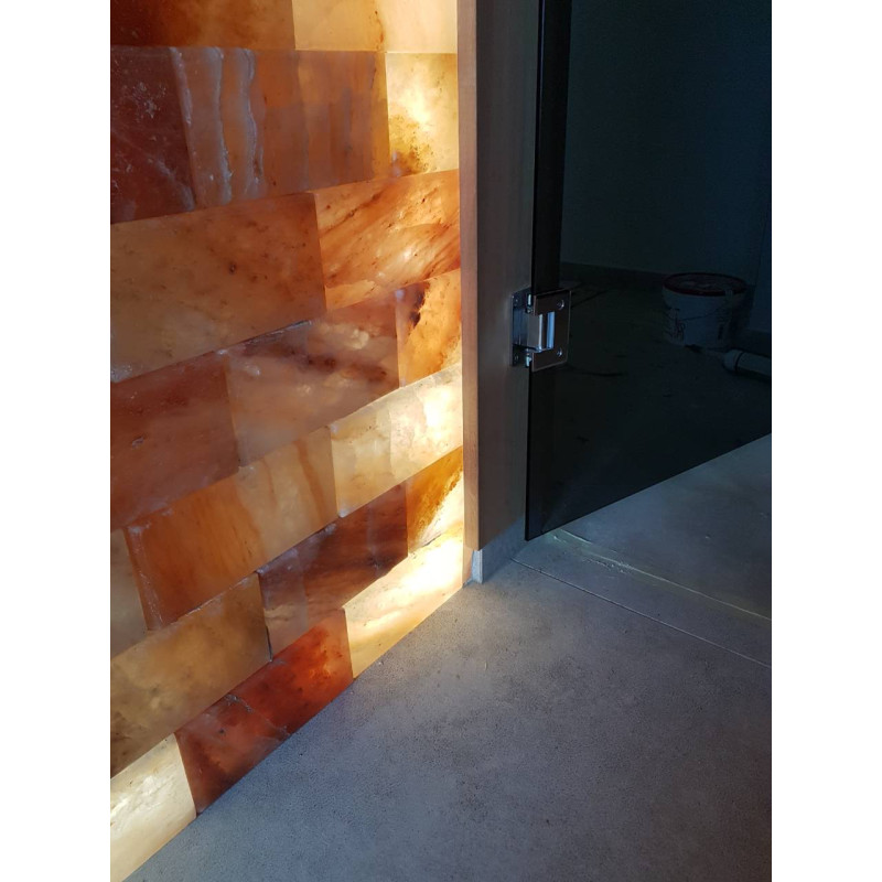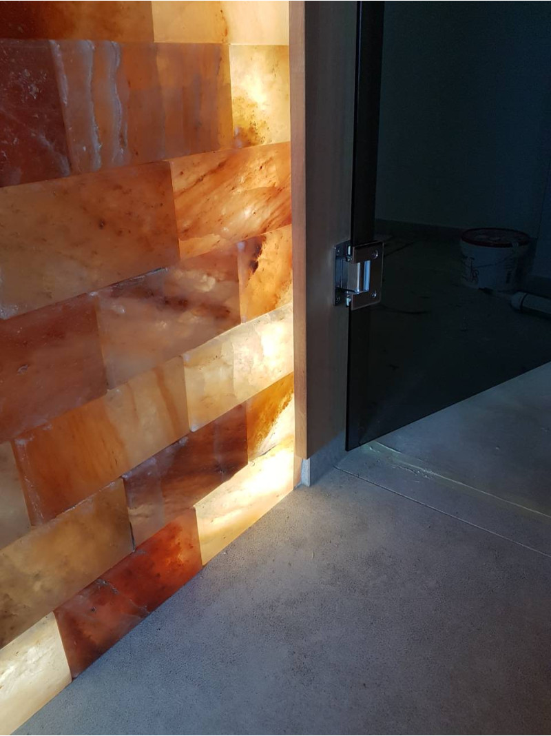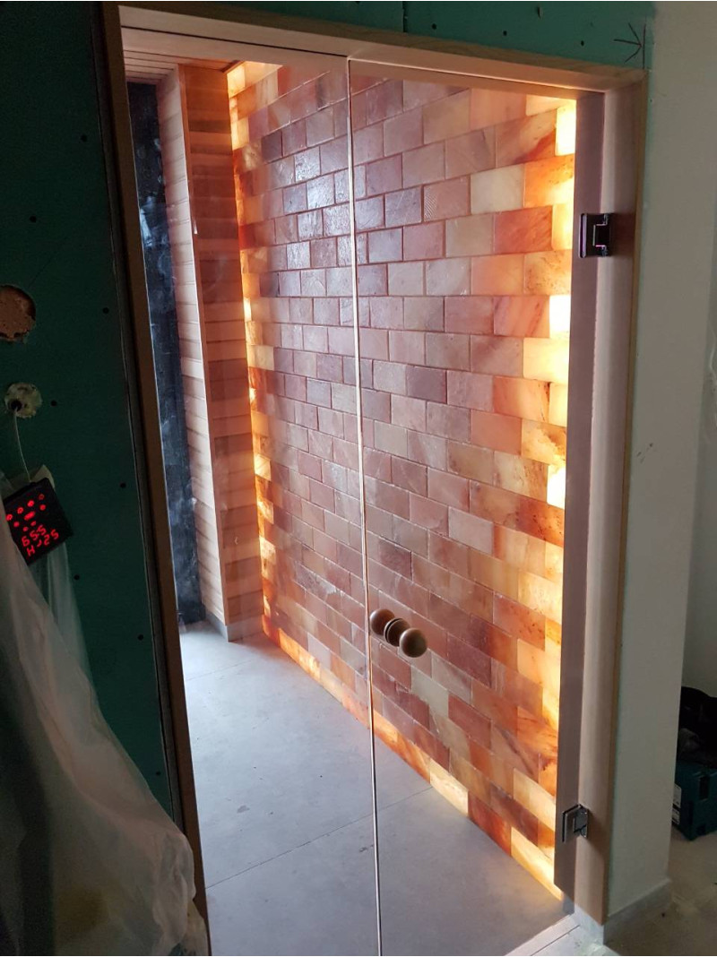 Le sauna est équipé d'un mur d'aspect unique de blocs de sel de l'Himalaya. Cette image est encore renforcée par l'éclairage blanc chaud intégré sous les blocs de sel, soulignant la couleur et les motifs du sel. Le sel de l'Himalaya est utilisé dans le sauna non seulement pour sa beauté, mais on prétend que le sel de l'Himalaya réduit les symptômes d'allergies et d'asthme, améliore l'humeur et fournit de l'énergie, neutralise le rayonnement électromagnétique, réduit l'électricité statique dans l'air.
