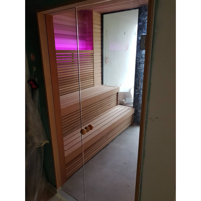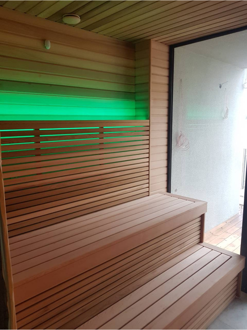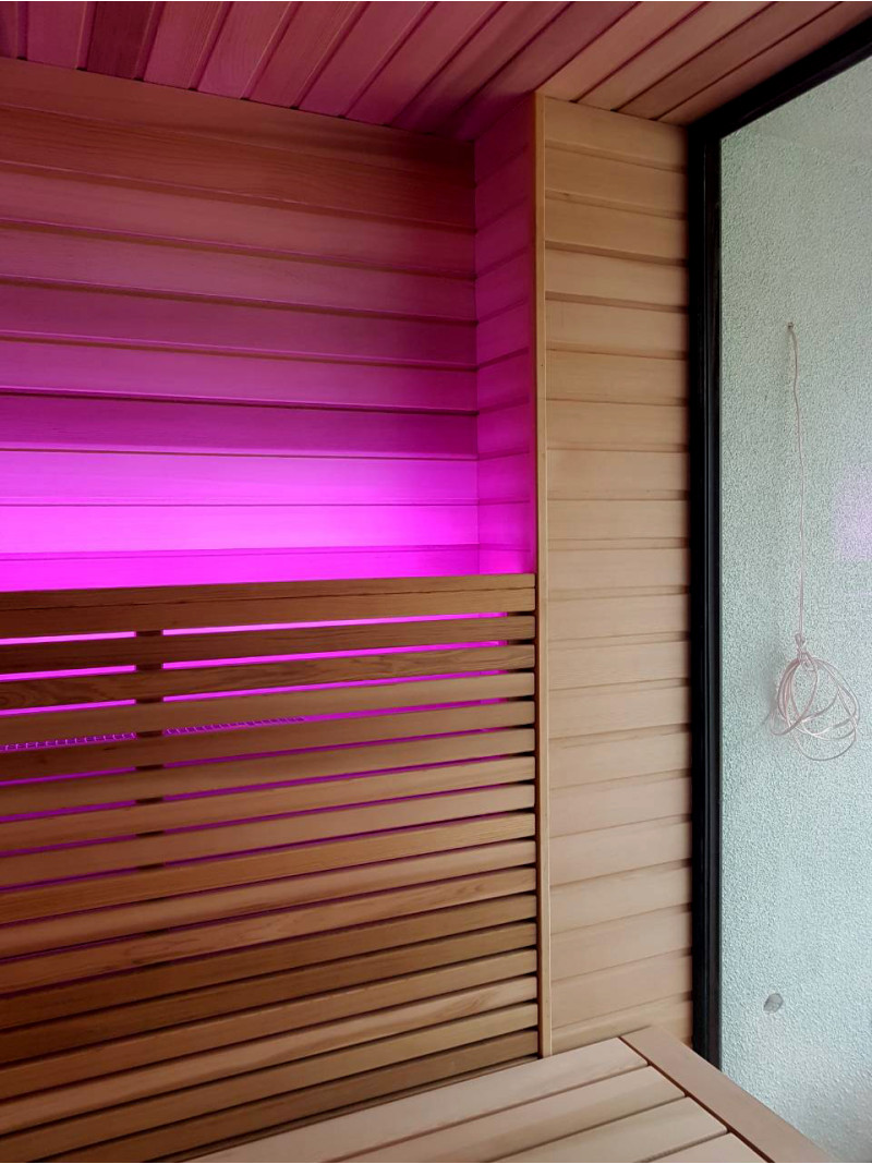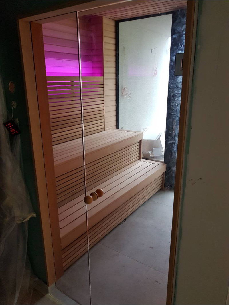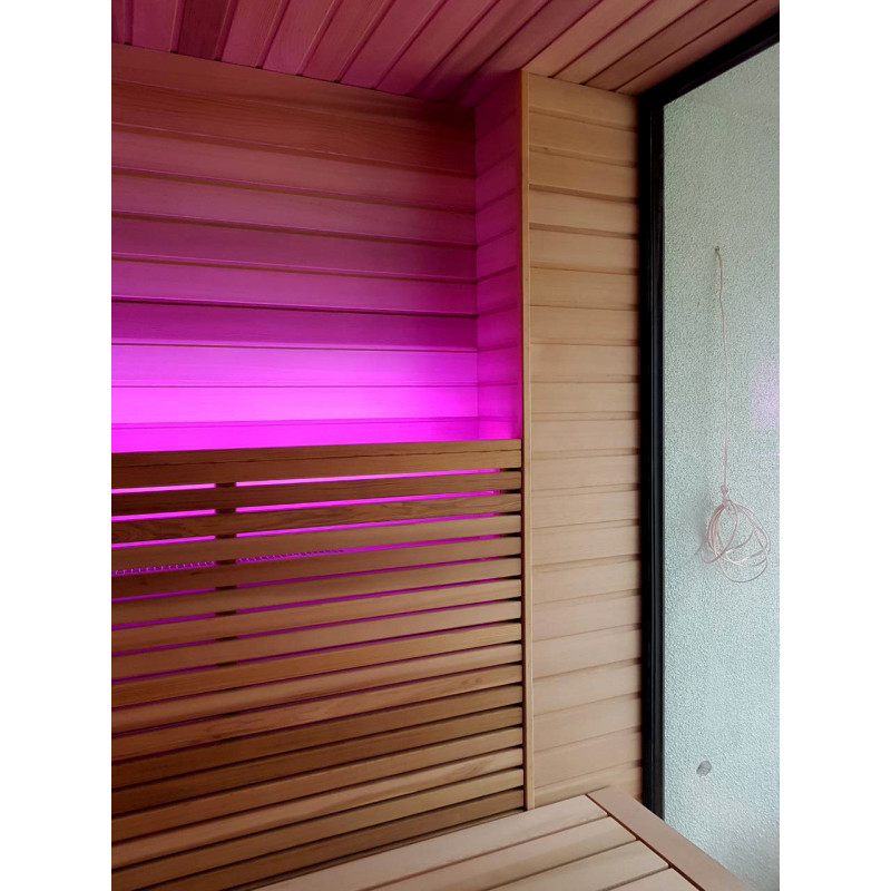 Le sauna est équipé d'un mur d'aspect unique de blocs de sel de l'Himalaya. Cette image est encore renforcée par l'éclairage blanc chaud intégré sous les blocs de sel, soulignant la couleur et les motifs du sel. Le sel de l'Himalaya est utilisé dans le sauna non seulement pour sa beauté, mais on prétend que le sel de l'Himalaya réduit les symptômes d'allergies et d'asthme, améliore l'humeur et fournit de l'énergie, neutralise le rayonnement électromagnétique, réduit l'électricité statique dans l'air.