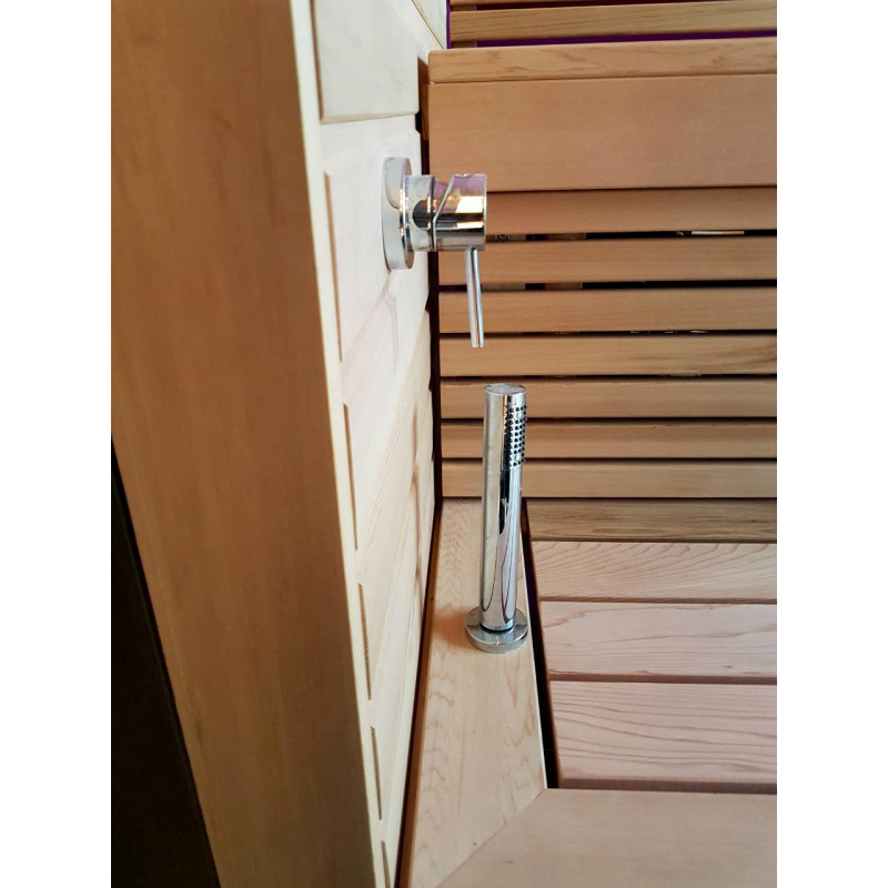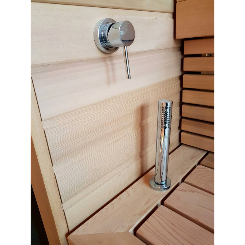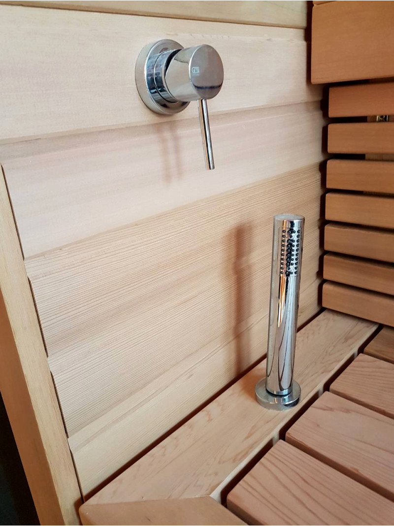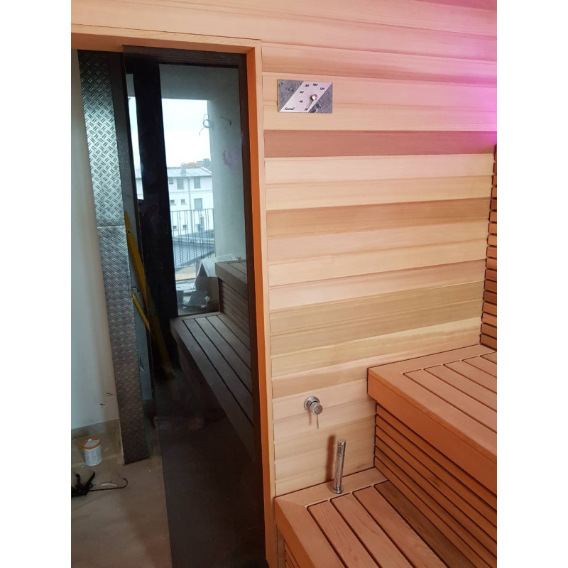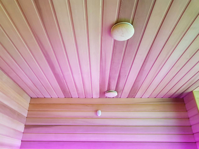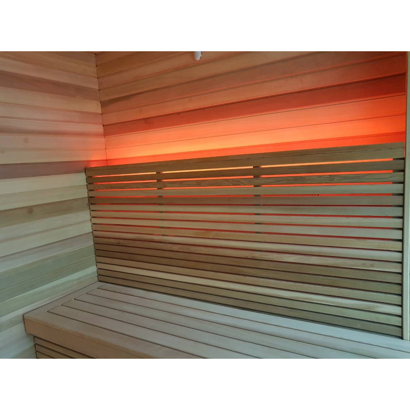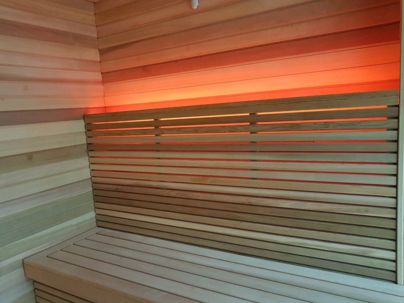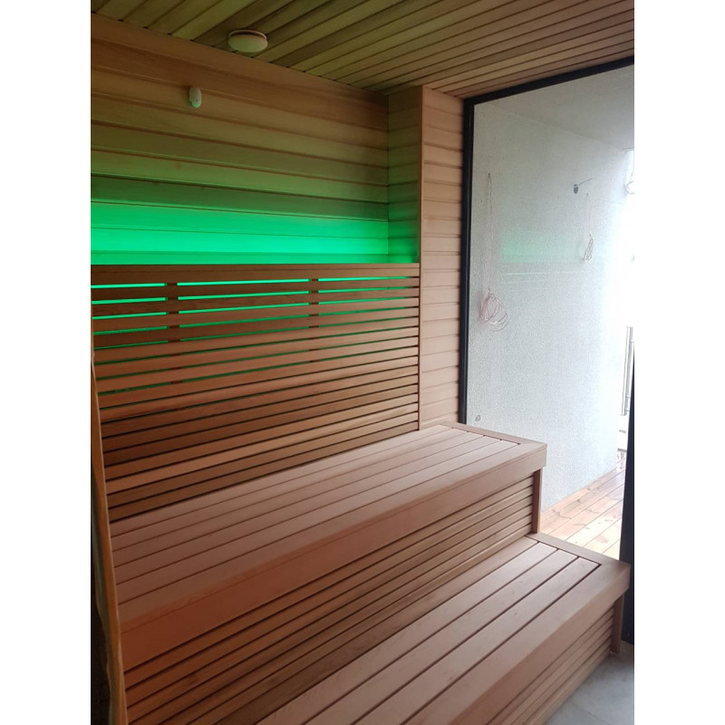 Les détails intérieurs en bois du sauna sont en bois de cèdre. Ce bois est extrêmement durable, résistant à l'usure et ne se déforme pas. À haute température, le revêtement de cèdre n'émet pas de résines. Il réfléchit très bien la chaleur, ce qui est essentiel dans les saunas et les bains. Le bois de cèdre émet des huiles essentielles et crée l'effet de l'aromathérapie naturelle.