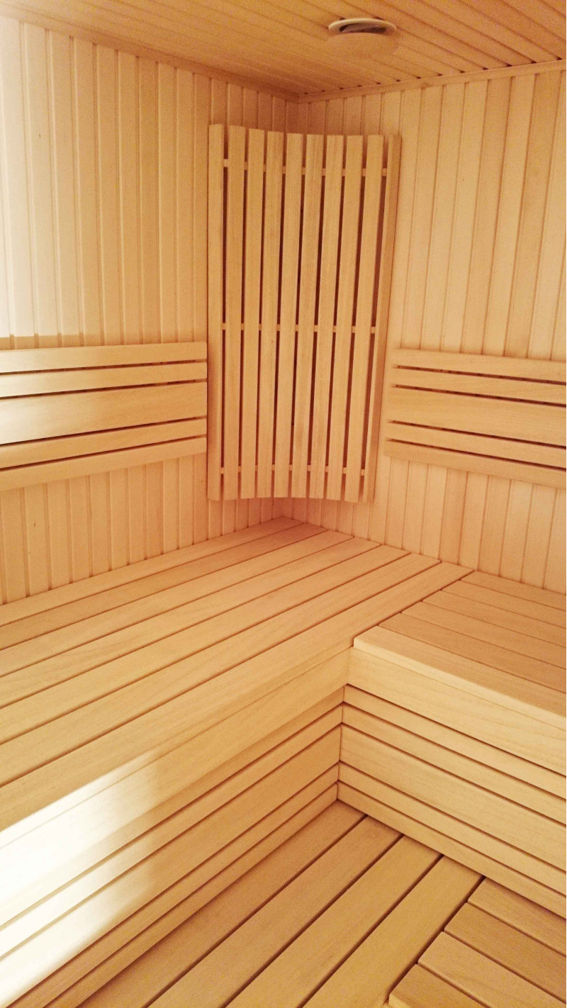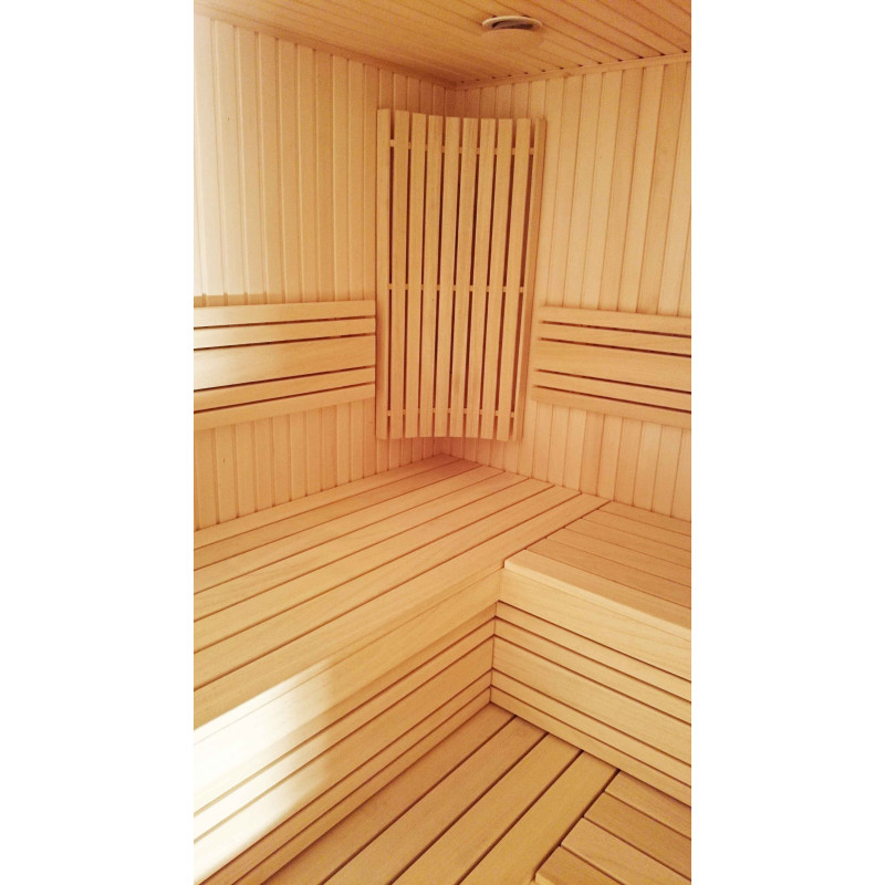 Les plafonds et les murs du sauna sont recouverts de parement de tilleul, tout comme les supports, les caillebotis au sol et les clôtures de chauffage. Les chaises longues de sauna sont en bois d'abachi de la plus haute qualité. Le bois pour lits, supports et murs est imprégné et verni, huilé - spécialement préparé pour une utilisation dans la chaleur et l'humidité.