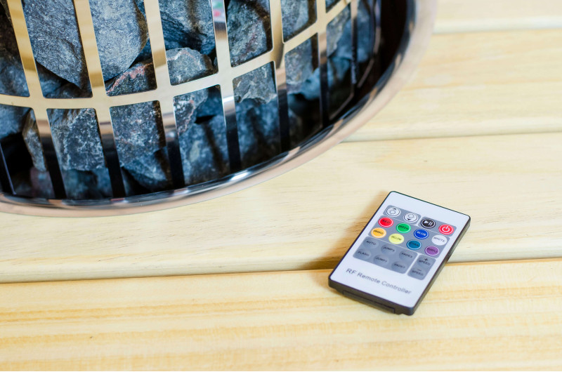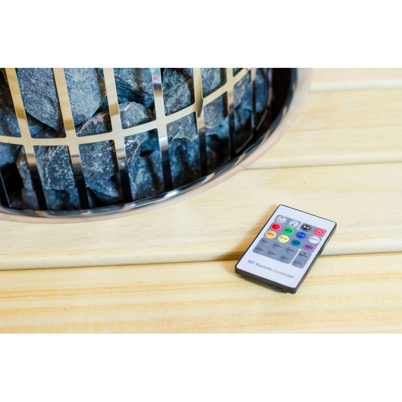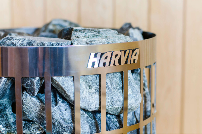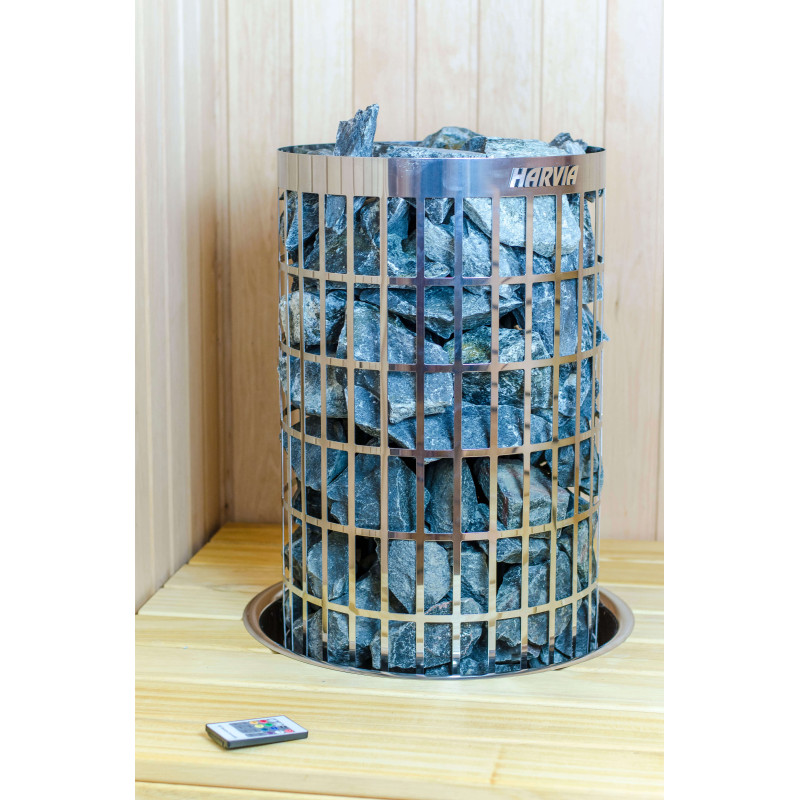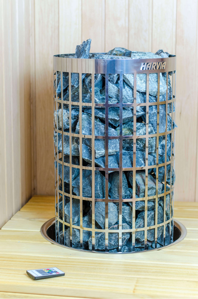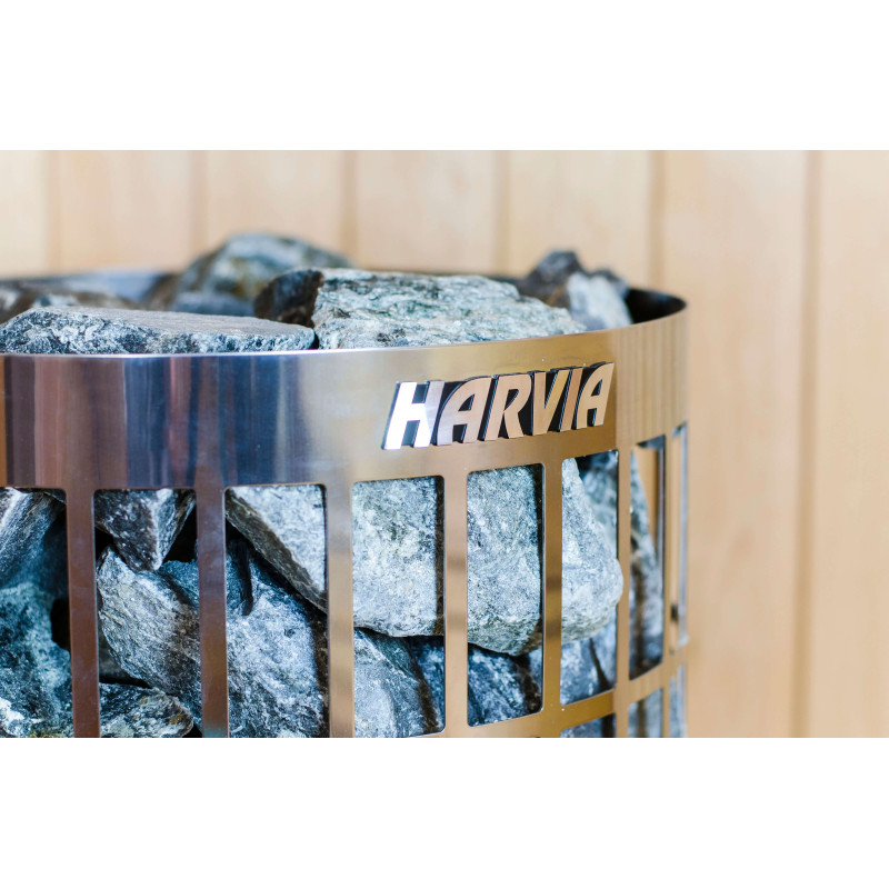 Réchauffeur - Harvia Cilindro avec un anneau de finition et rempli de pierres de diabase de gabbro. Portes - verre bronze trempé avec cadre en aulne noir.