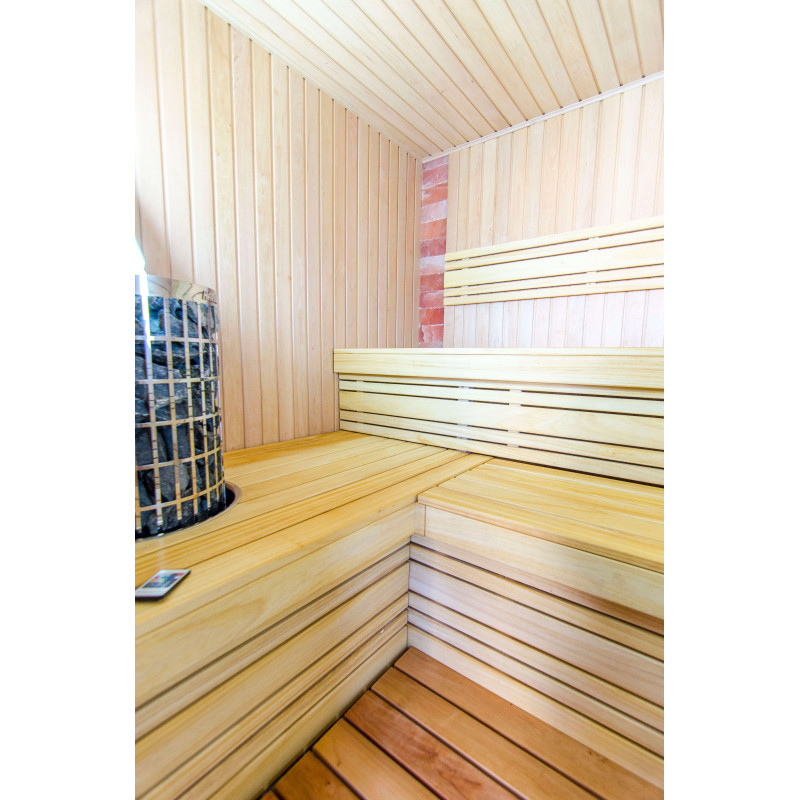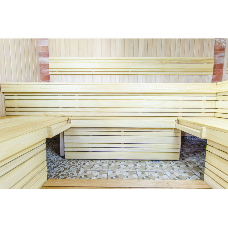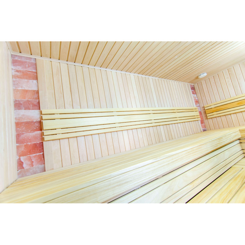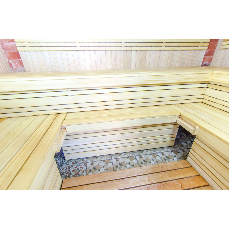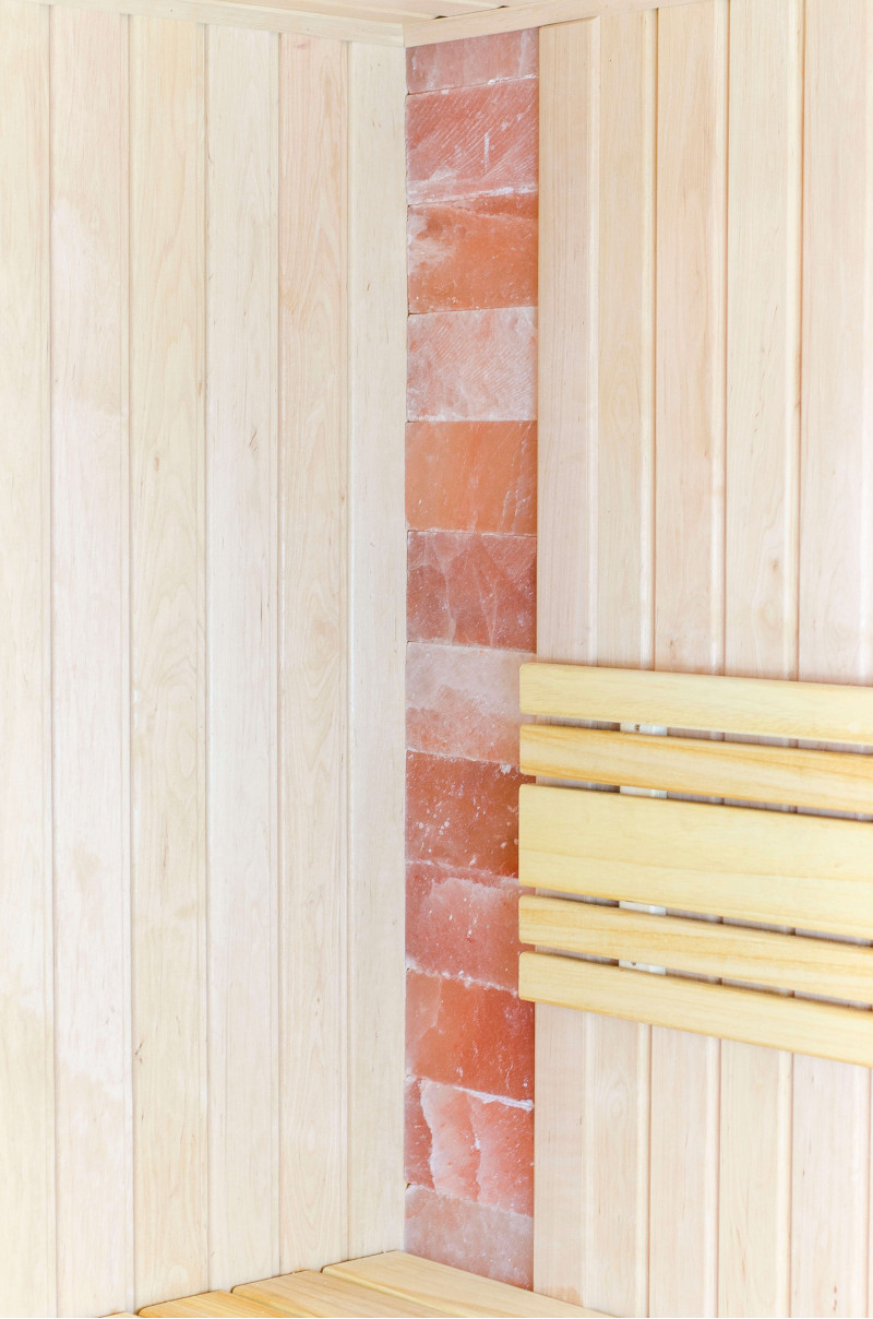 Bancs, dossiers, plafonds, murs - en bois d'abachi africain non chauffant haut de gamme, caillebotis au sol - en bois d'aulne noir. Les dossiers et derrière les briques de sel de l'Himalaya sont dotés d'un éclairage RVB couleur intégré, contrôlé par une console à changement de couleur sans fil qui accentue l'aspect distinctif du sel de l'Himalaya.