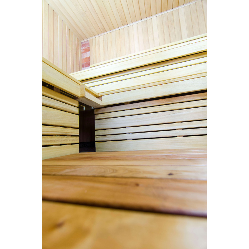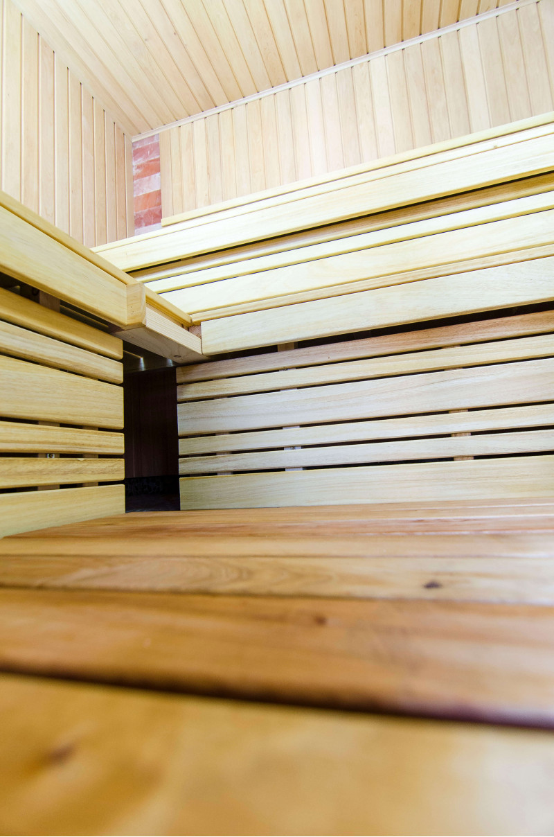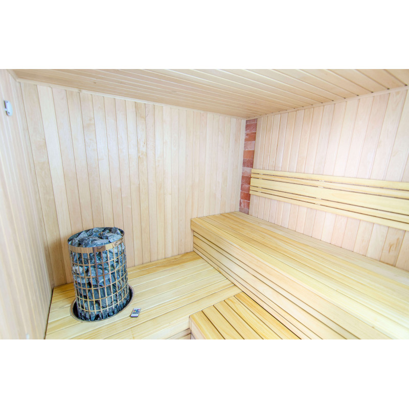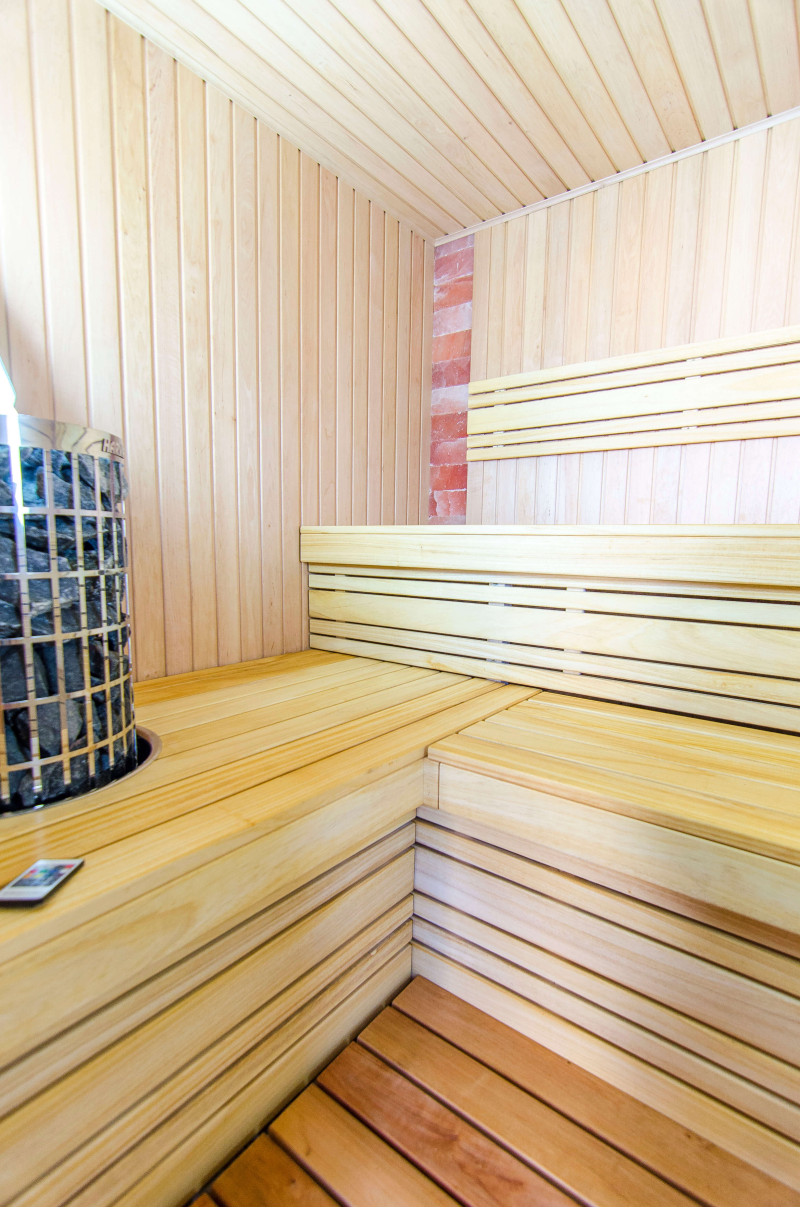 Bancs, dossiers, plafonds, murs - en bois d'abachi africain non chauffant haut de gamme, caillebotis au sol - en bois d'aulne noir. Les dossiers et derrière les briques de sel de l'Himalaya sont dotés d'un éclairage RVB couleur intégré, contrôlé par une console à changement de couleur sans fil qui accentue l'aspect distinctif du sel de l'Himalaya.