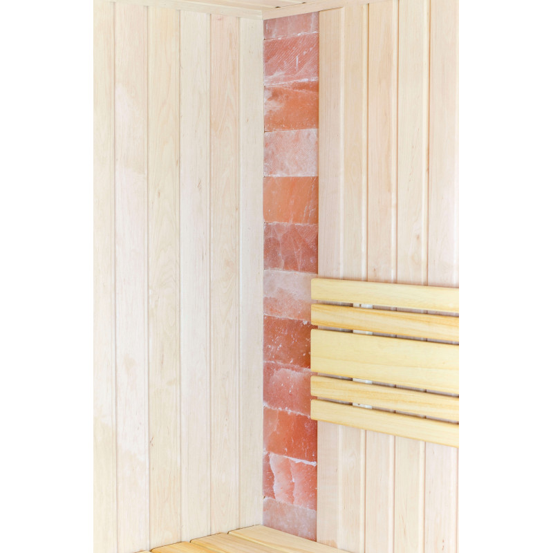 Les briques de sel de l'Himalaya sélectionnées pour la décoration du sauna avec éclairage intégré créent une ambiance chaleureuse et renforcent encore l'effet du sauna. Les pierres de sel de l'Himalaya sont un ioniseur naturel qui améliore efficacement la qualité de l'air en émettant des ions négatifs. L'air ionisé négativement améliore la santé, aide à traiter de nombreuses affections telles que : asthme bronchique, maladies pulmonaires et bronchiques, post-infarctus, hypertension, ulcères gastro-intestinaux, gastrite, maladies de la thyroïde, dermatite, allergies diverses, maladies nerveuses, aide à surmonter les accidents vasculaires cérébraux. Les avantages de faire les procédures dans un tel sauna seront doubles.