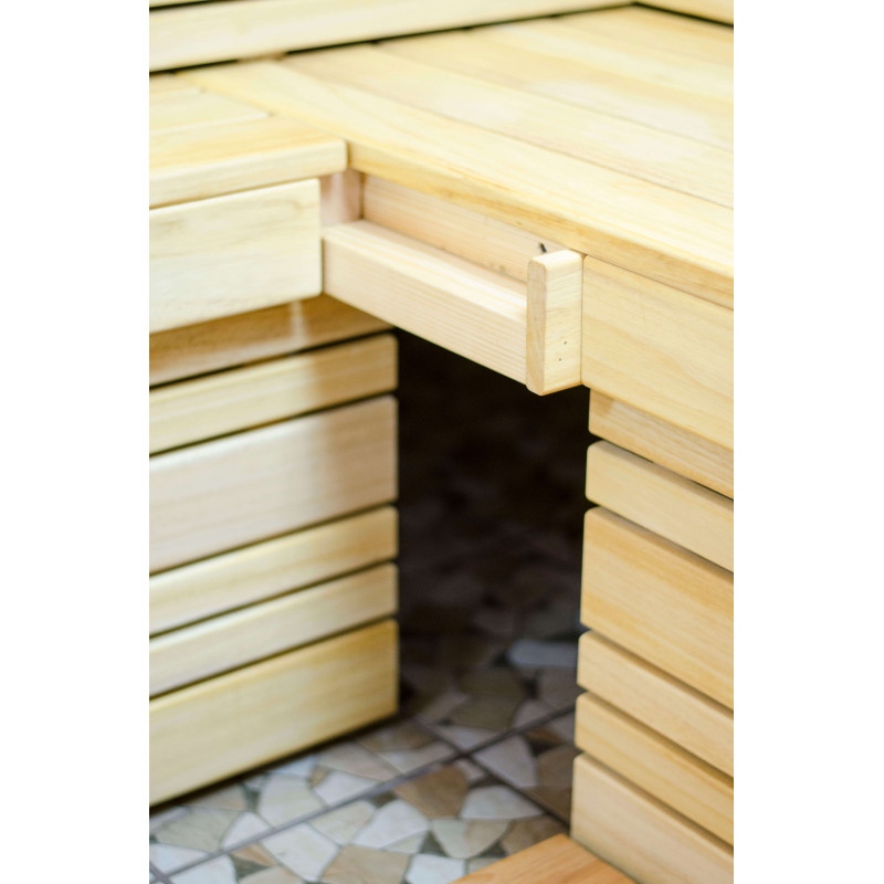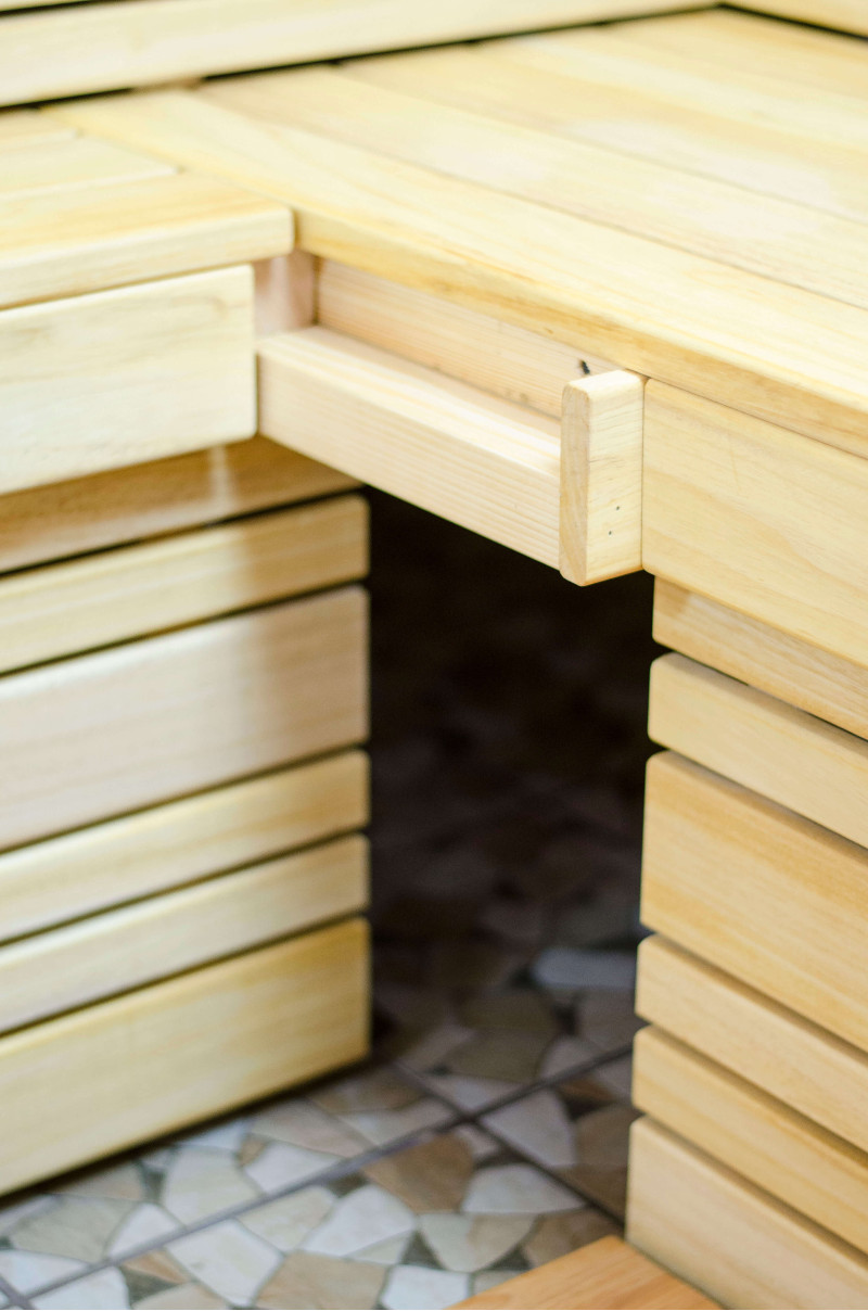 Le plus grand avantage de ce sauna est la banquette inférieure coulissante pour un bain confortable. À la demande du client, des transats suffisamment larges et à la bonne hauteur ont été conçus pour se tenir confortablement. Pendant la baignade, le transat se transforme en coin salon. Le large bain de soleil permet de se baigner beaucoup plus confortablement, car il est possible de se mettre les pieds là où il fait plus chaud.