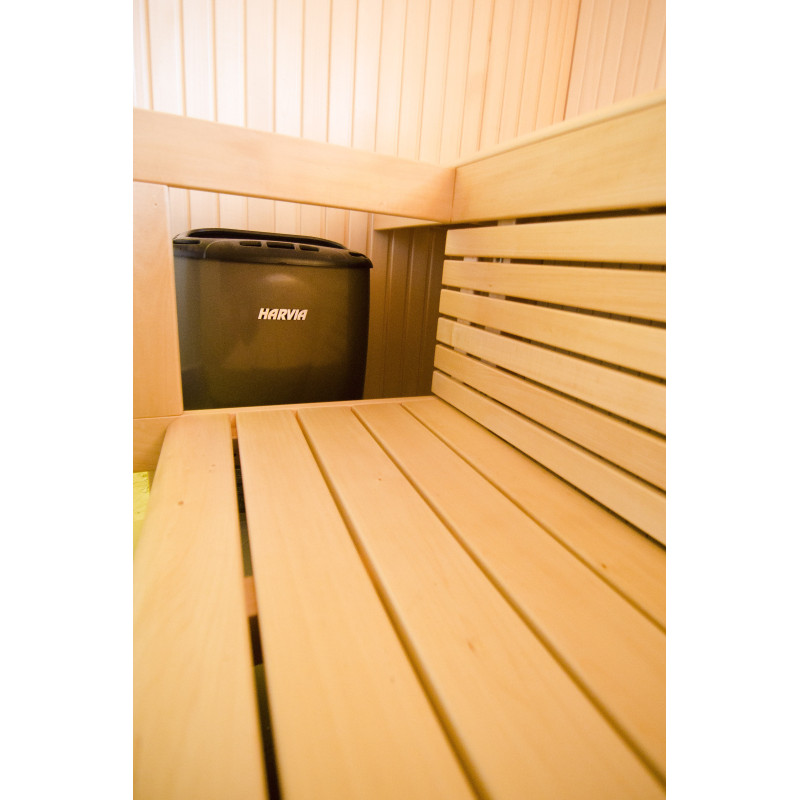 Le poêle est un élément clé de tout le sauna. Il est responsable du fonctionnement de l'ensemble du sauna, ce qui signifie que le poêle nécessite une attention particulière. Dans ce cas, le poêle de sauna électrique Harvia Moderna (8 kw) a été choisi. Les radiateurs électriques ne nécessitent pas beaucoup d'entretien, il y a moins de risque d'incendie.
