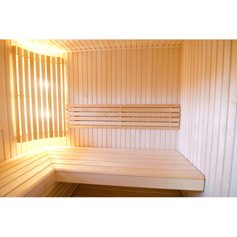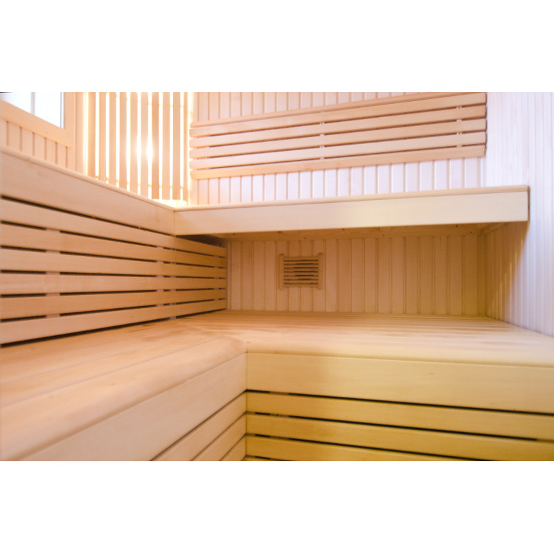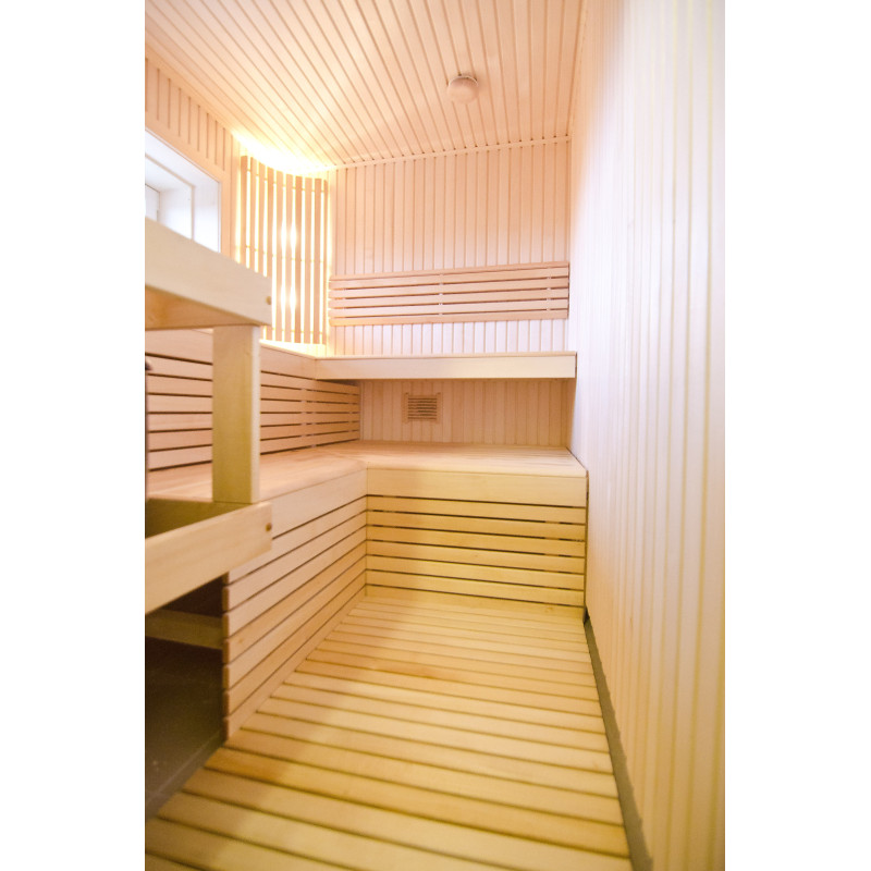 Les revêtements muraux et les bancs sont fabriqués à partir de bois de tilleul de la plus haute qualité. Le bois est extrêmement léger, ce qui donne au sauna une impression d'espace.