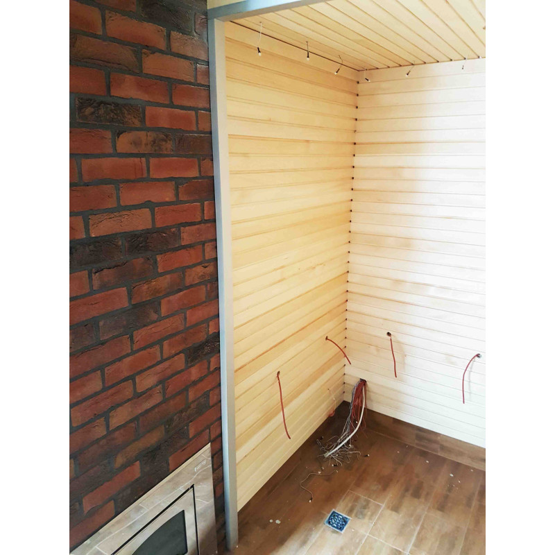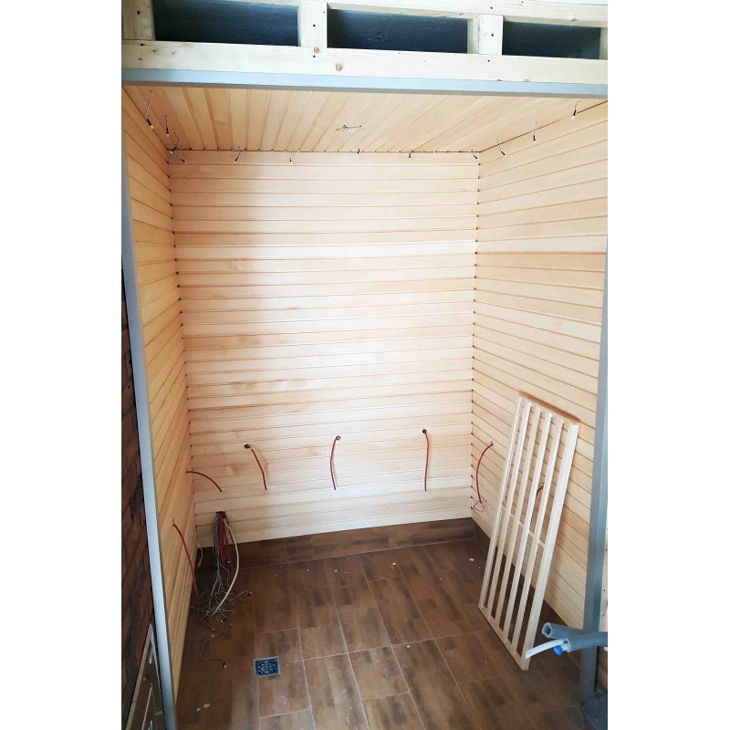 Les plafonds, les murs et les bancs sont en bois de tilleul avec des éléments décoratifs en bois de cèdre. Caillebotis en aulne noir. Les supports des bancs et les murs sont vernis et cirés, assurant la durabilité du bois.