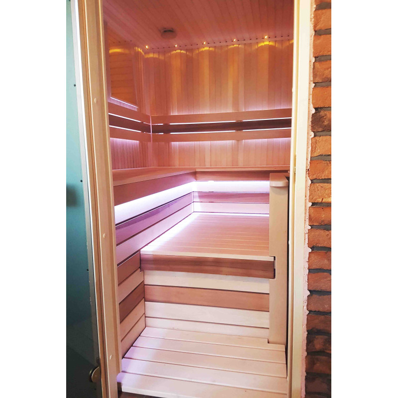 Éclairage de sauna résistant à l'humidité et à la chaleur - La LED "Sun" est installée. Sous les transats et dans les dossiers - éclairage couleur RVB contrôlé par un changeur de couleurs à distance.