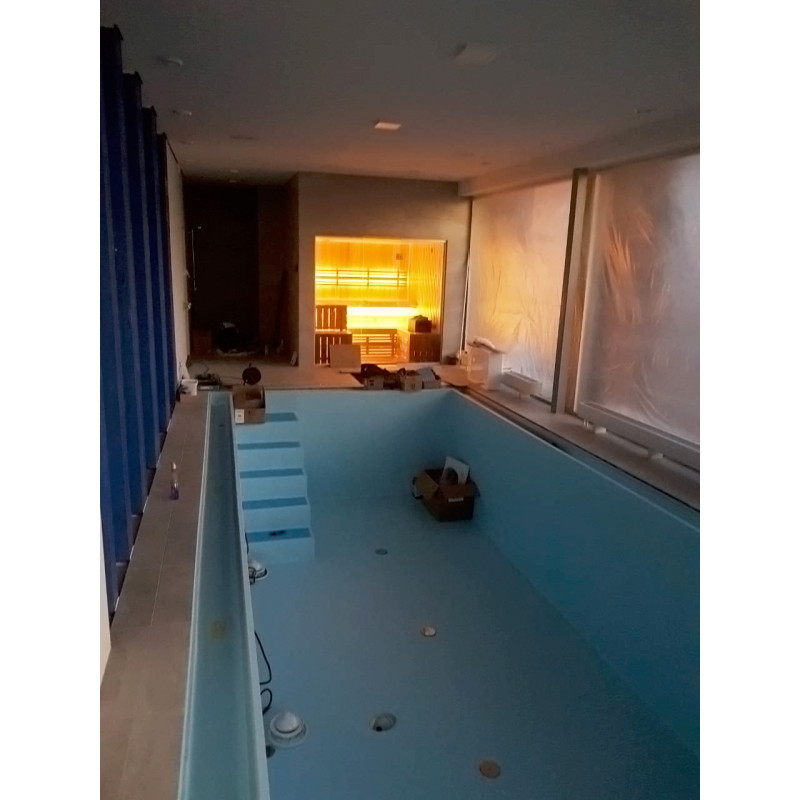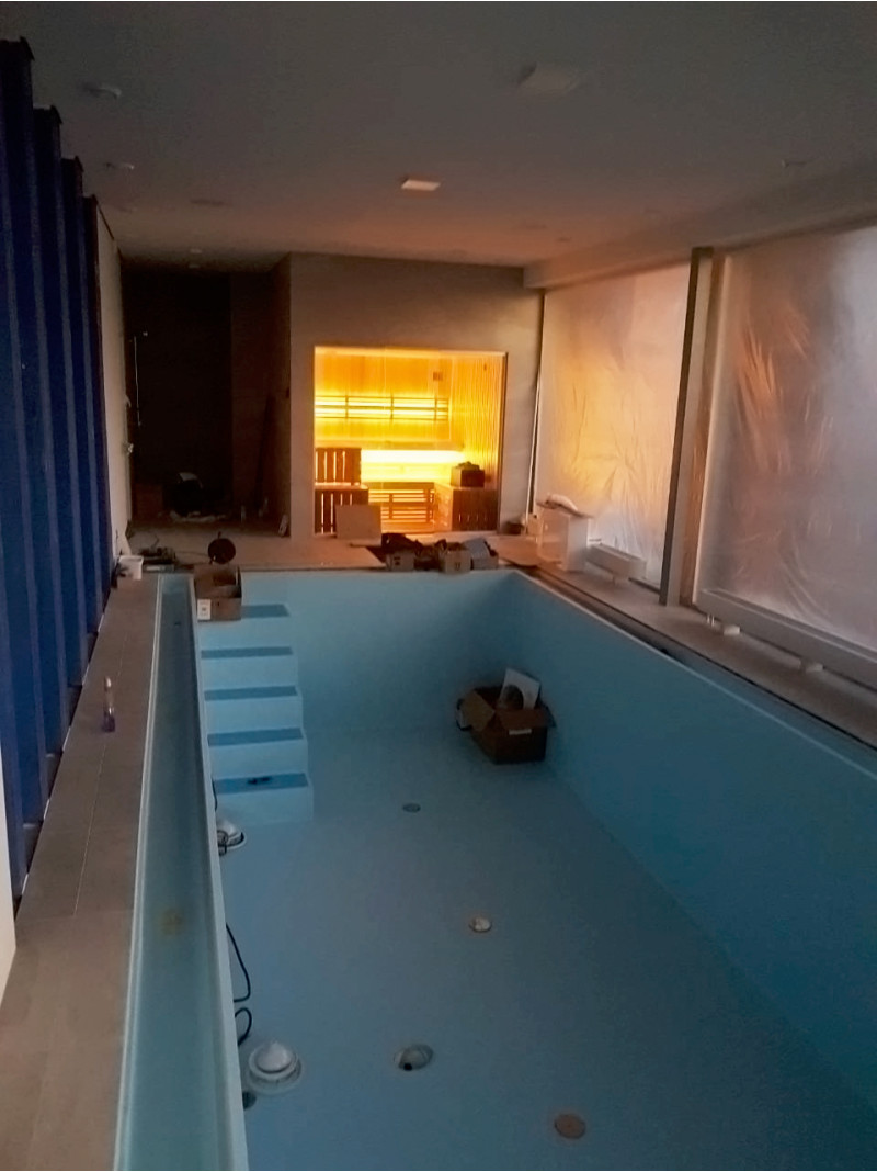 Installation d'une vitrine en verre - verre trempé teinté 8 mm dans un cadre en aluminium. Grâce à la vitrine en verre, la vue sur l'espace piscine s'ouvre, le petit sauna s'agrandit et le sauna est plus lumineux.