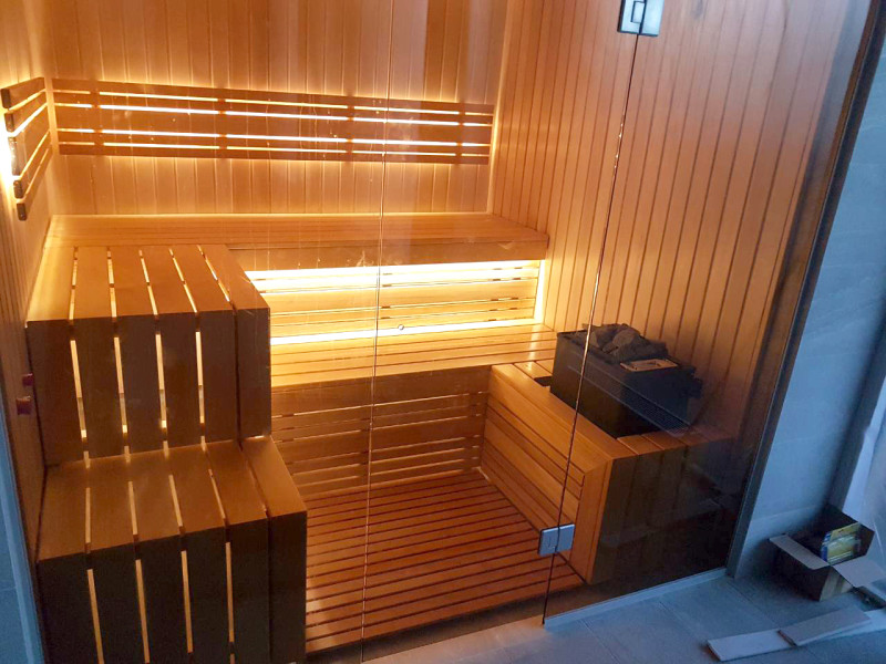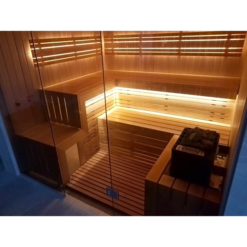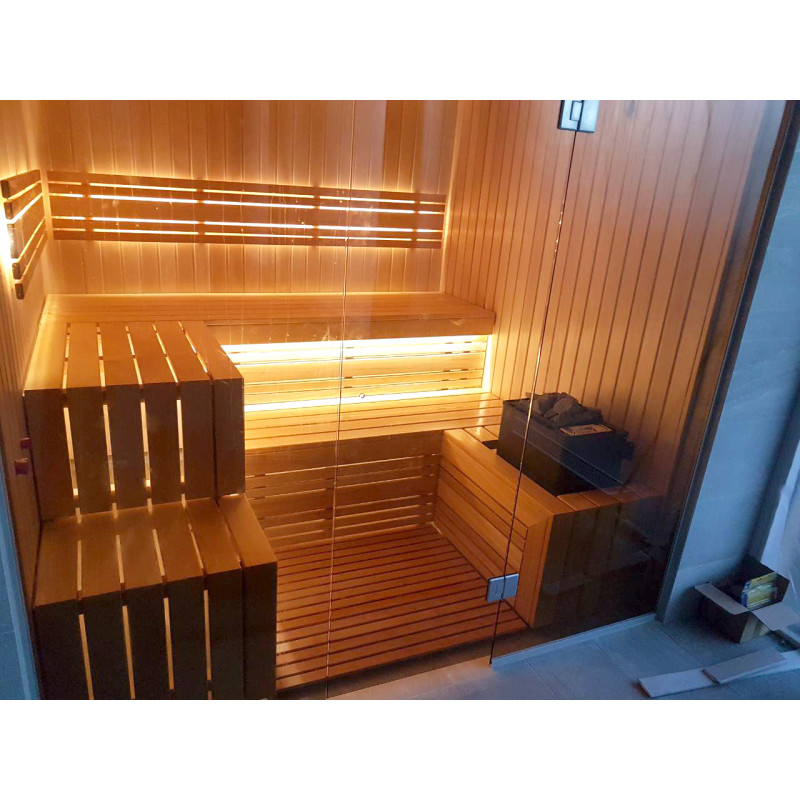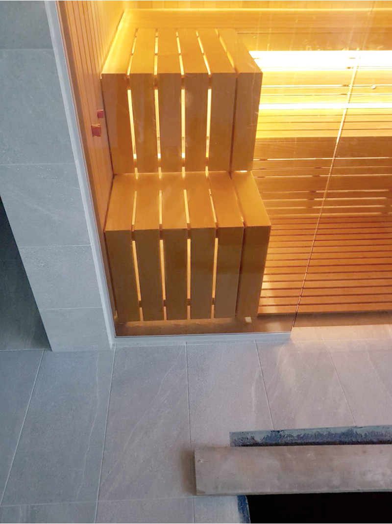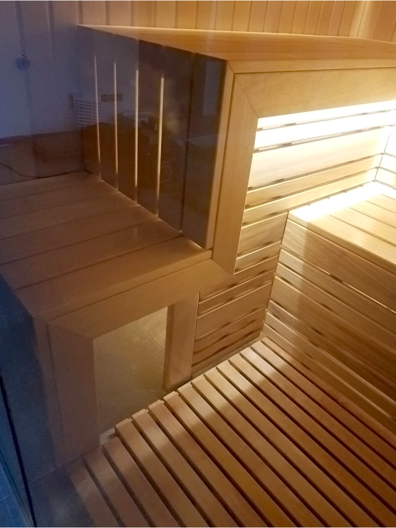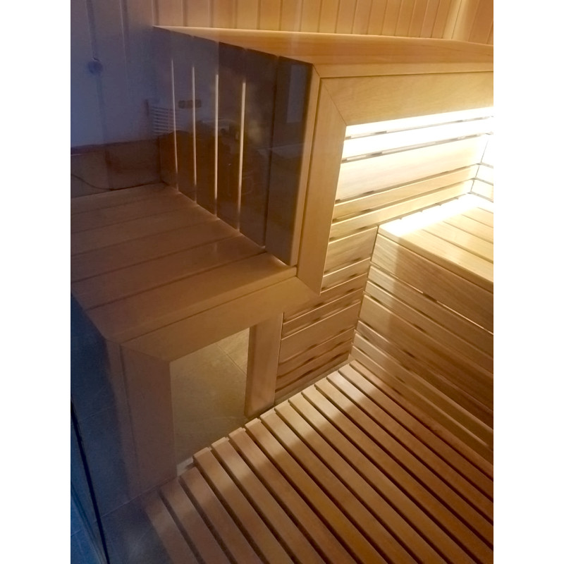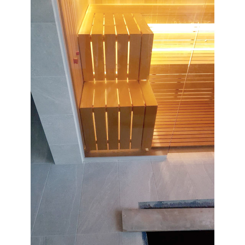 Le bois d'abachi pour les bancs et les dossiers est un excellent choix, car ce bois de qualité ne surchauffe pas et il est impossible de se brûler lorsque vous êtes assis sur des bancs faits de ce bois. Le bois de cèdre donne également un look moderne à l'intérieur du sauna.