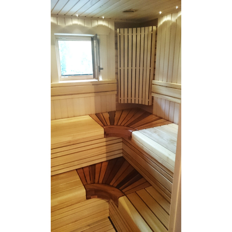L'intérieur du sauna est fait de bois de tilleul et de cèdre de la plus haute qualité, les bancs sont faits de bois d'abachi et de cèdre. Ce bois est le plus approprié pour les bancs, car il chauffe peu, il est sûr et agréable de toucher un tel bois.