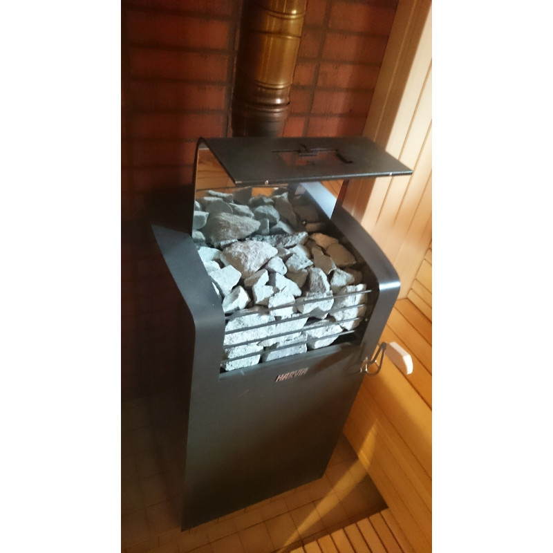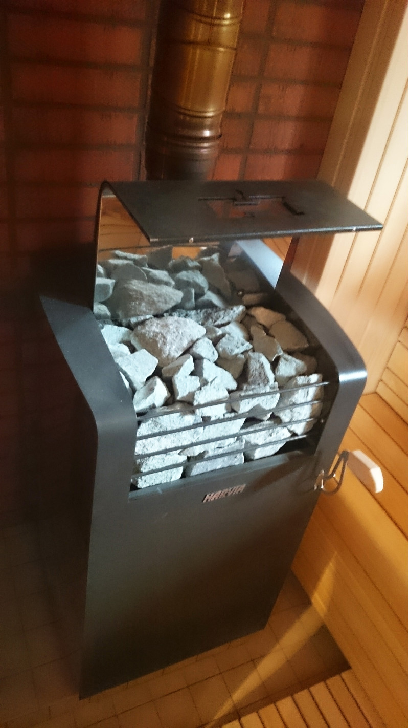 Une ventilation est fournie pour assurer une bonne circulation de l'air dans le sauna, et une cheminée avec un radiateur est installée. Le modèle de chauffage est du type fermé, qui accumule la chaleur et donne beaucoup de vapeur. Pendant le chauffage, le couvercle est fermé, versant de l'eau sur les pierres - il est ouvert.